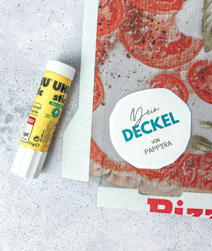 Deckel & Anhänger basteln: Klebe die grob ausgeschnittenen Vorlagen für Deckel und Anhänger auf deinen alten Karton. Lass alles trocknen und schneide es dann an der Linie aus.