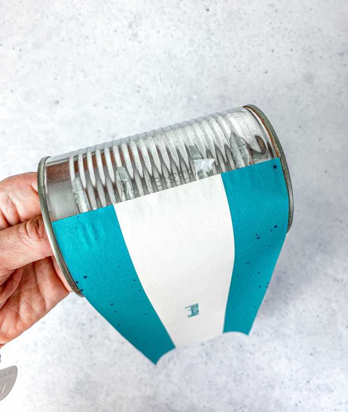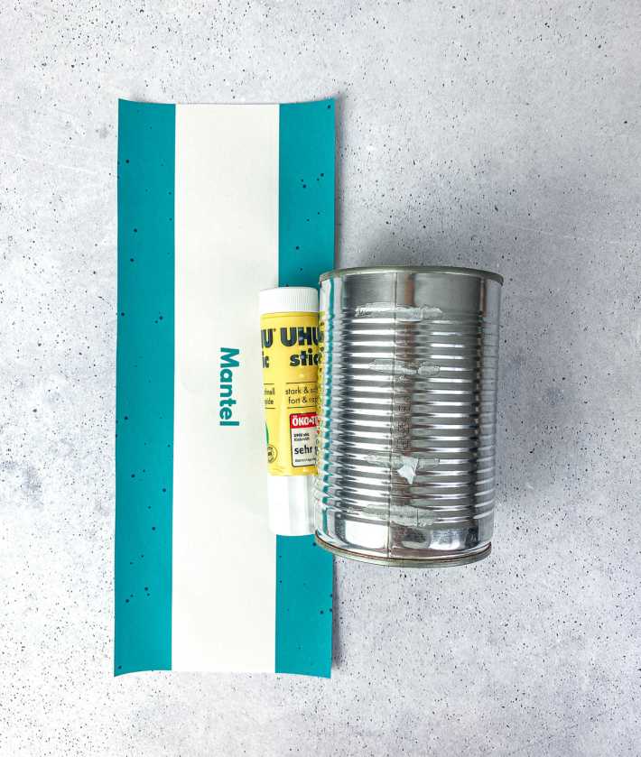 - Dose bekleben: Schneide den Mantel der Vorlage aus, streiche Kleber auf die Enden und wickle ihn fest um deine Dose.
