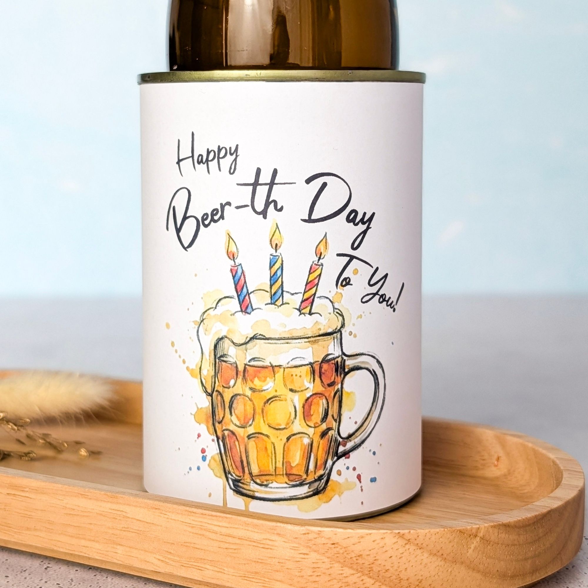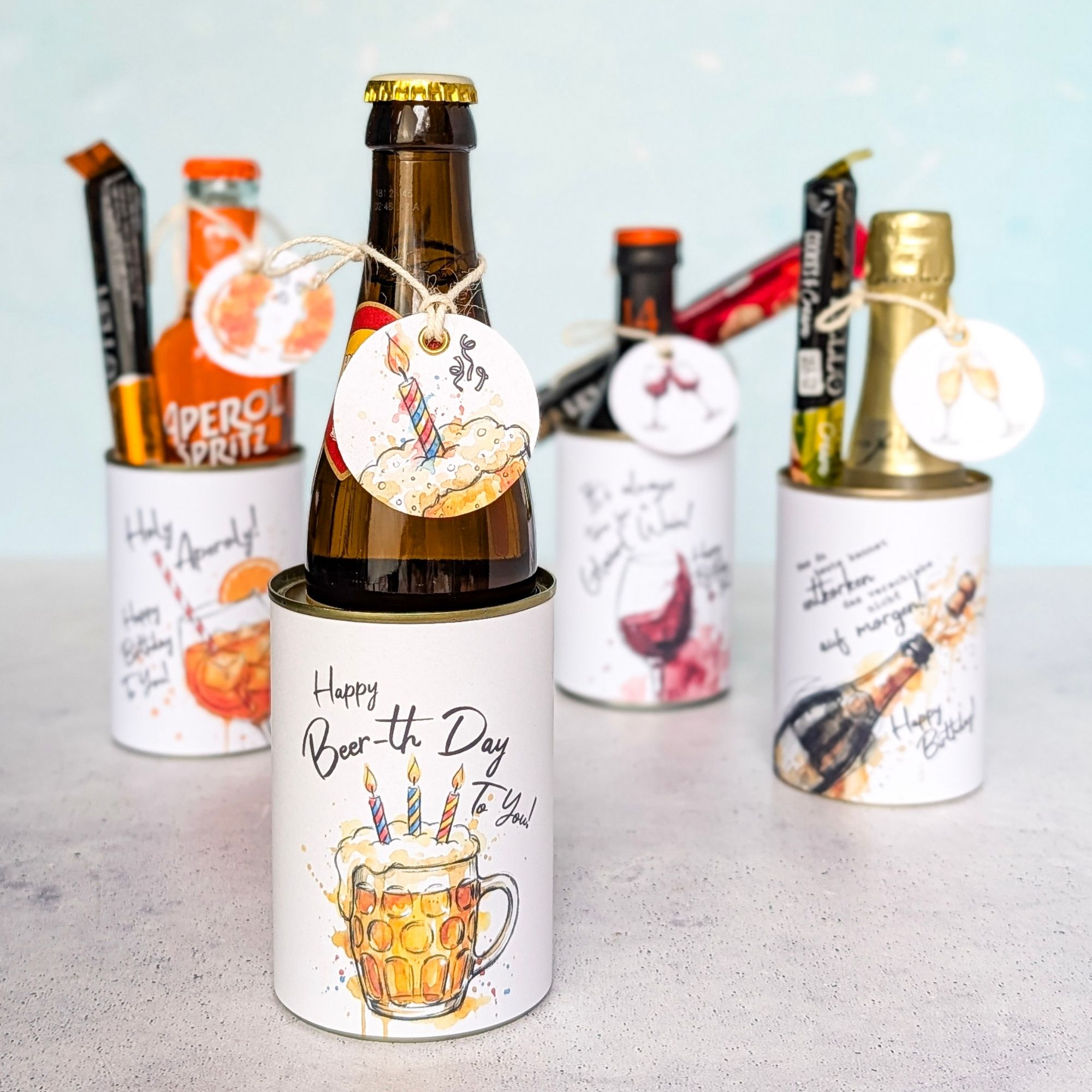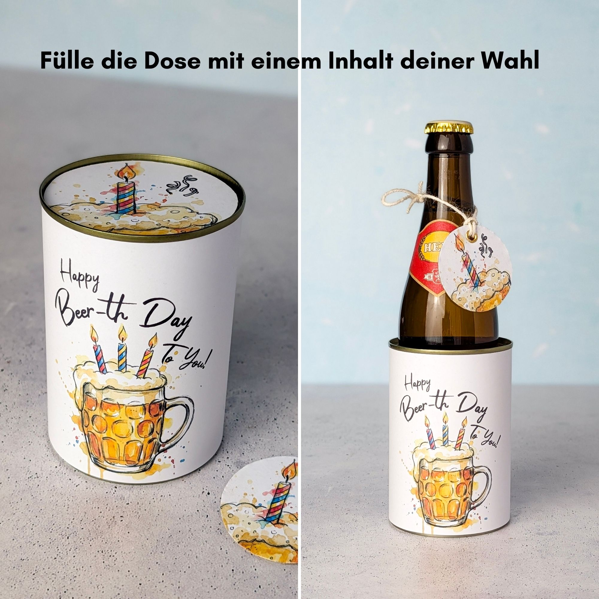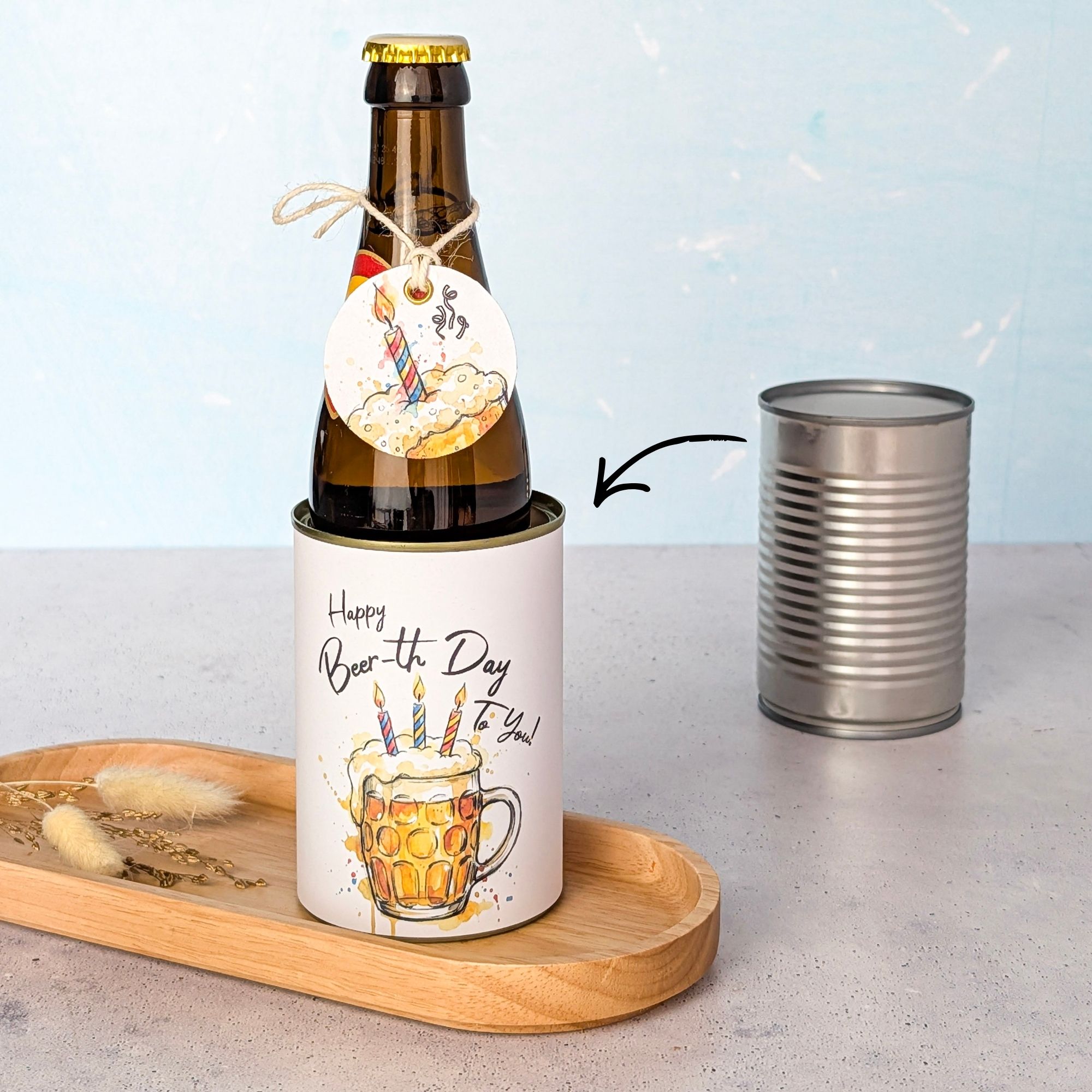 Liebevoll gestaltete Druckvorlage für eine witzige Konservendosen-Banderole als originelles Bier-Geschenk mit „Happy Beerth-Day“ Motiv.