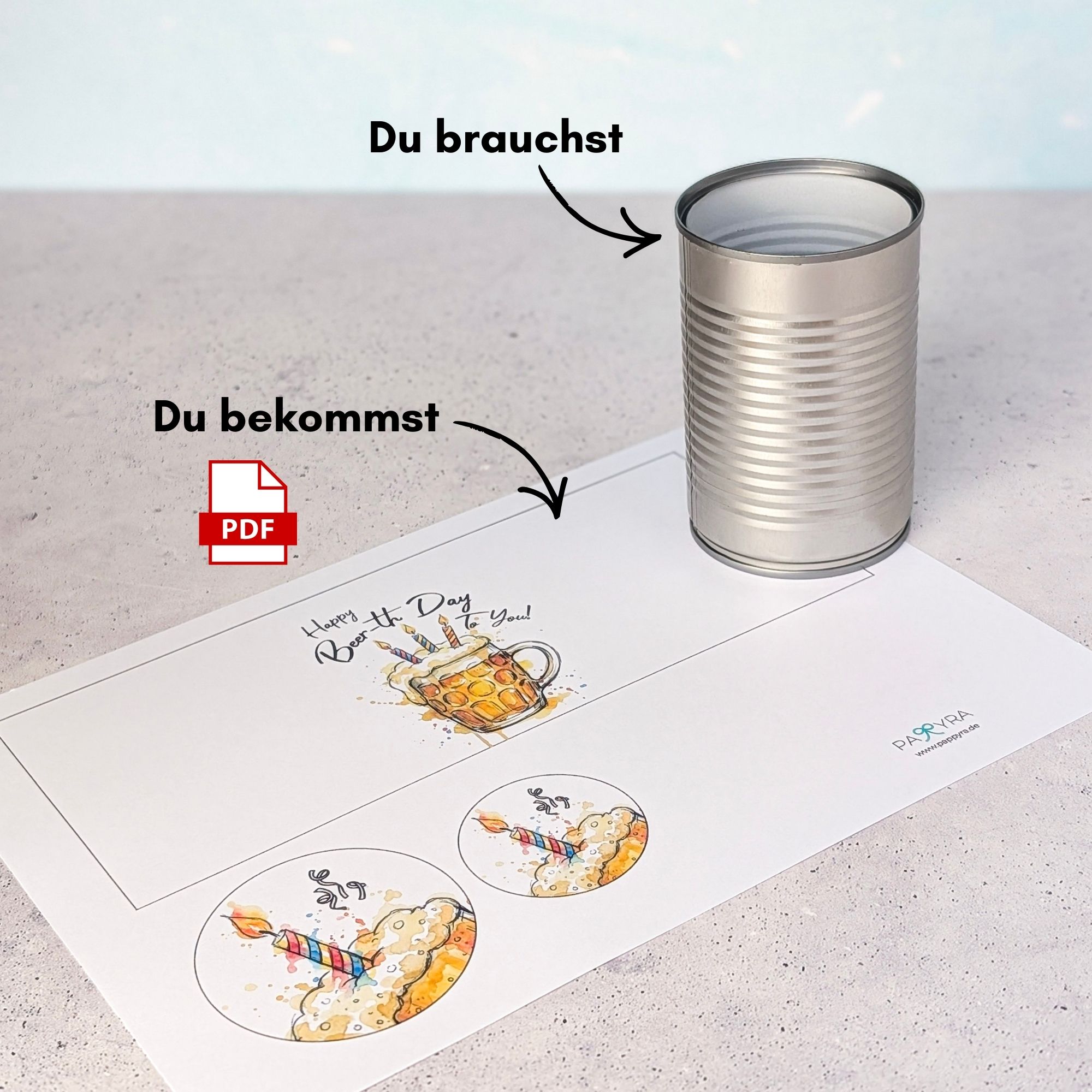 Mit dieser kreativen Druckvorlage verwandelst du eine einfache Konservendose in einen humorvollen Geburtstagsgruß. Die witzige „Happy Beerth-Day to You“-Banderole mit Bierkrug und Kerzen ist perfekt, wenn es schnell gehen muss und trotzdem was hermachen sein soll.