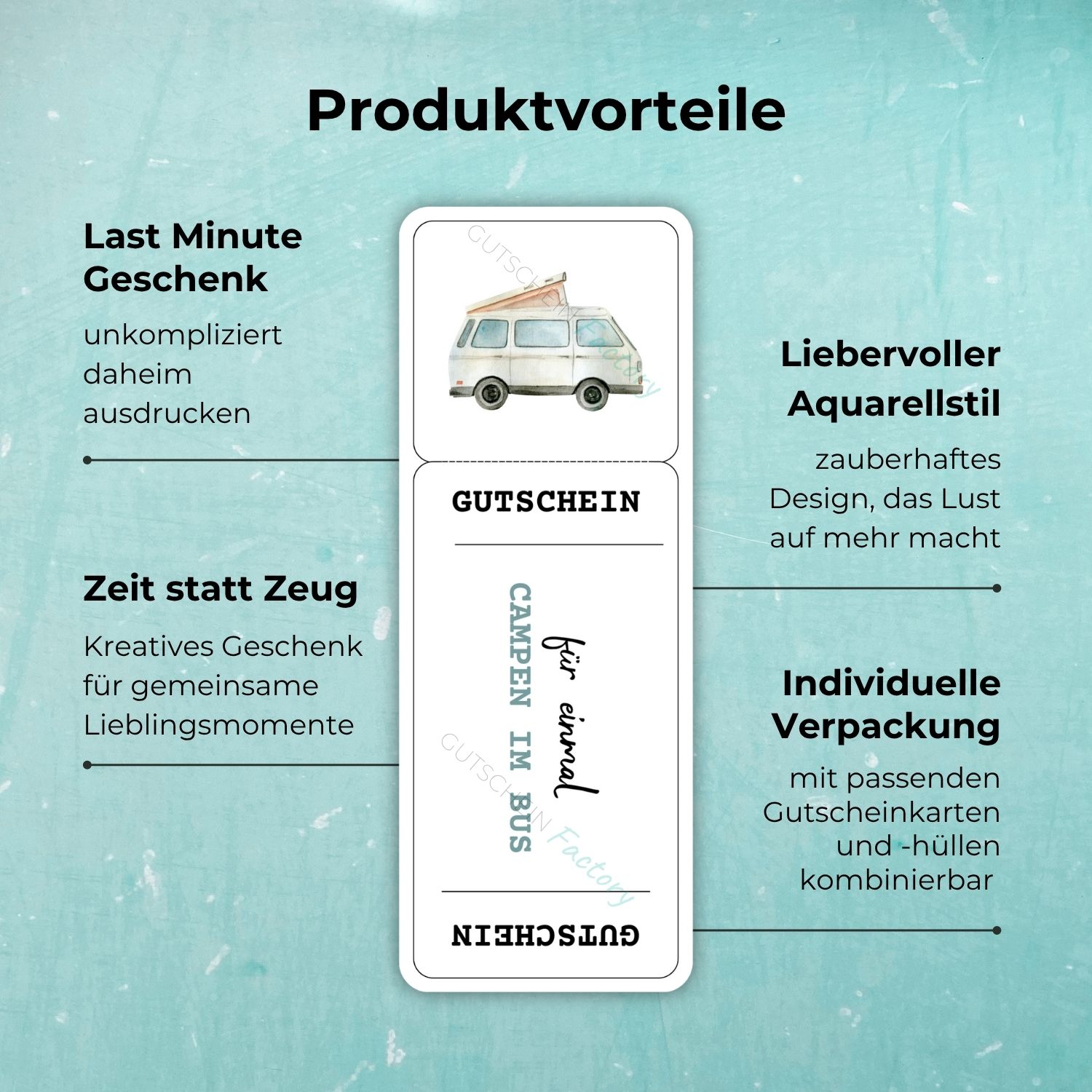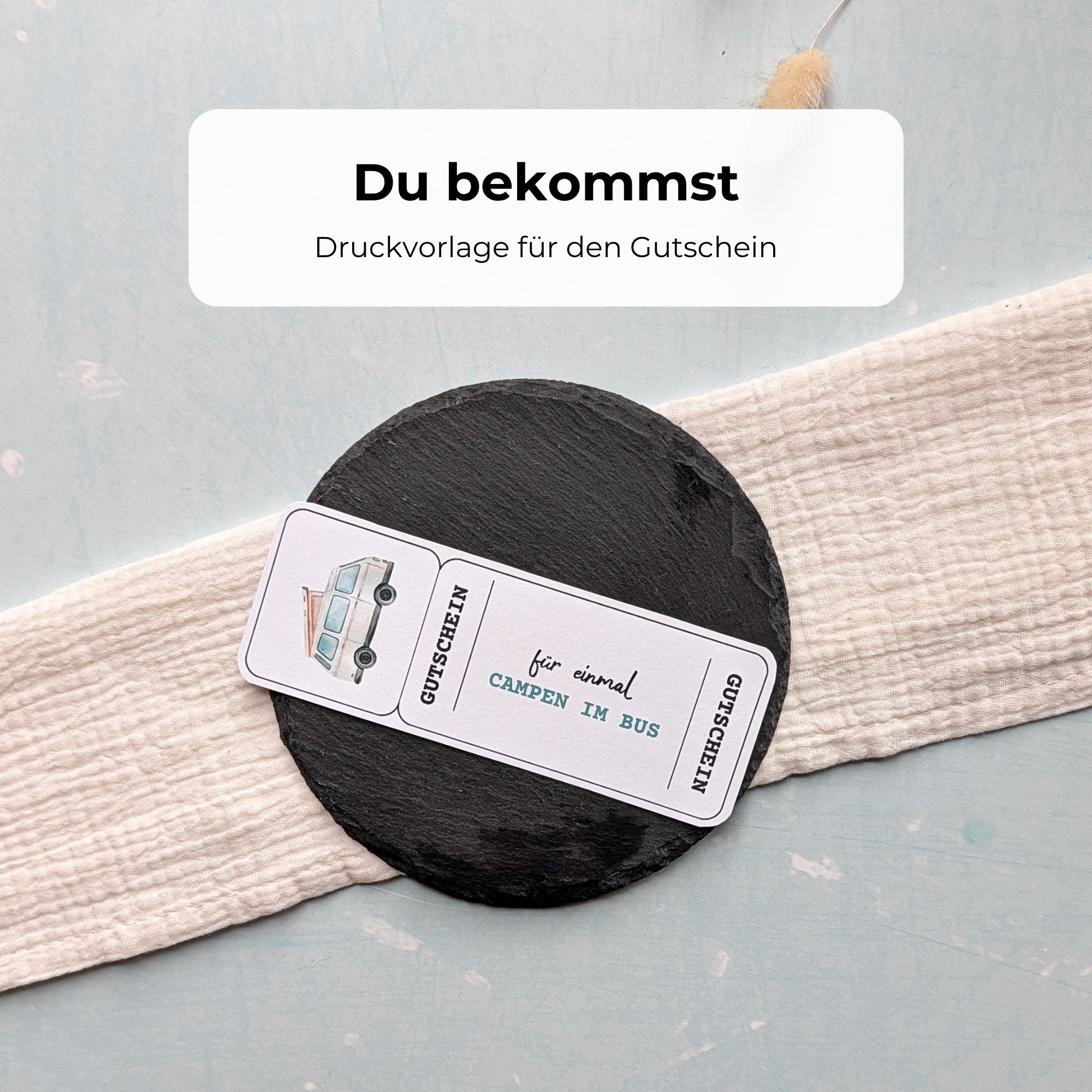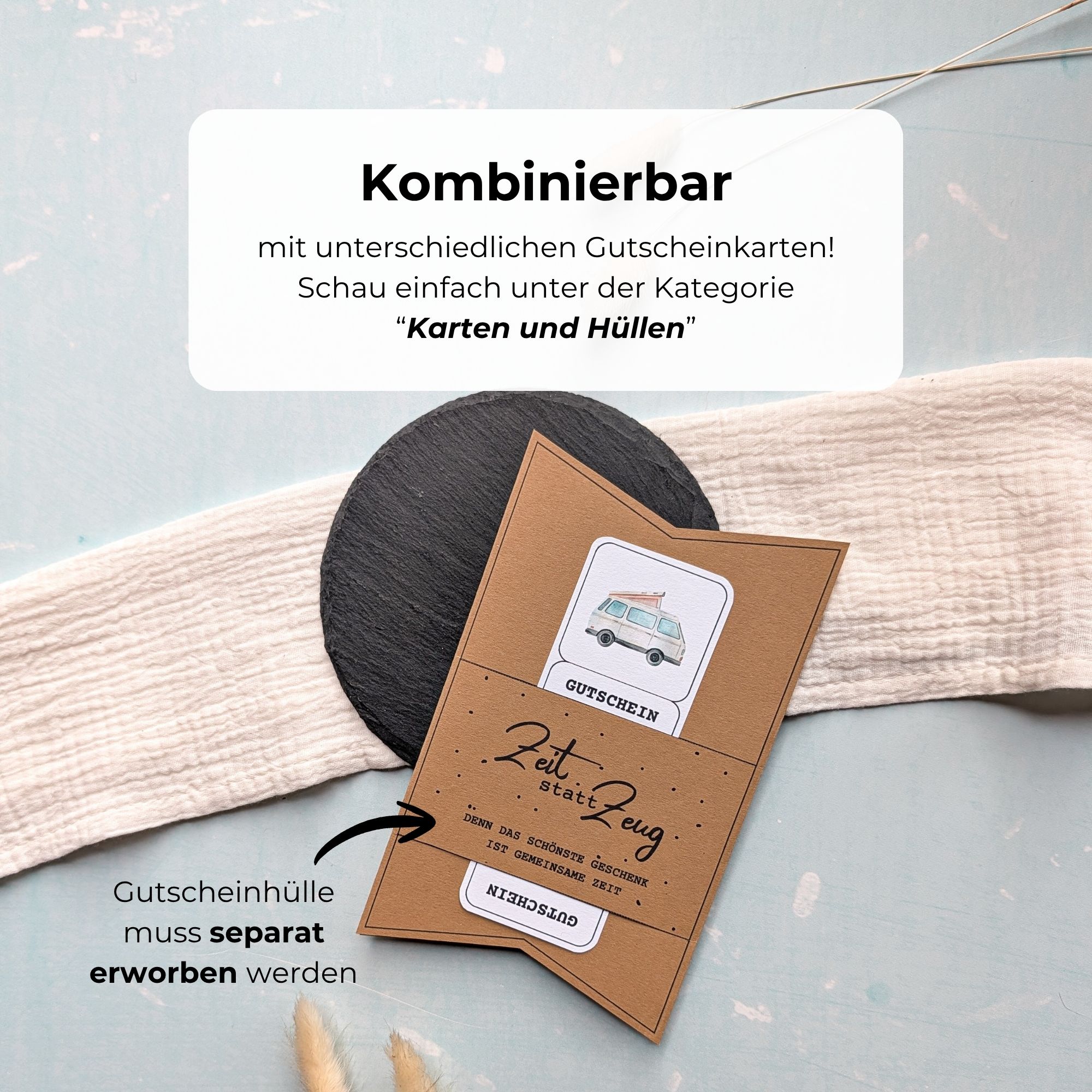 Du kannst dir einfach die Karte bzw. Hülle mit dem passenden Geschenkanlass aussuchen sie ganz einfach kombinieren, um deinem Geschenk den letzten Schliff zu geben. So einfach bastelst du einen Gutschein für einmal Campen im Bus.