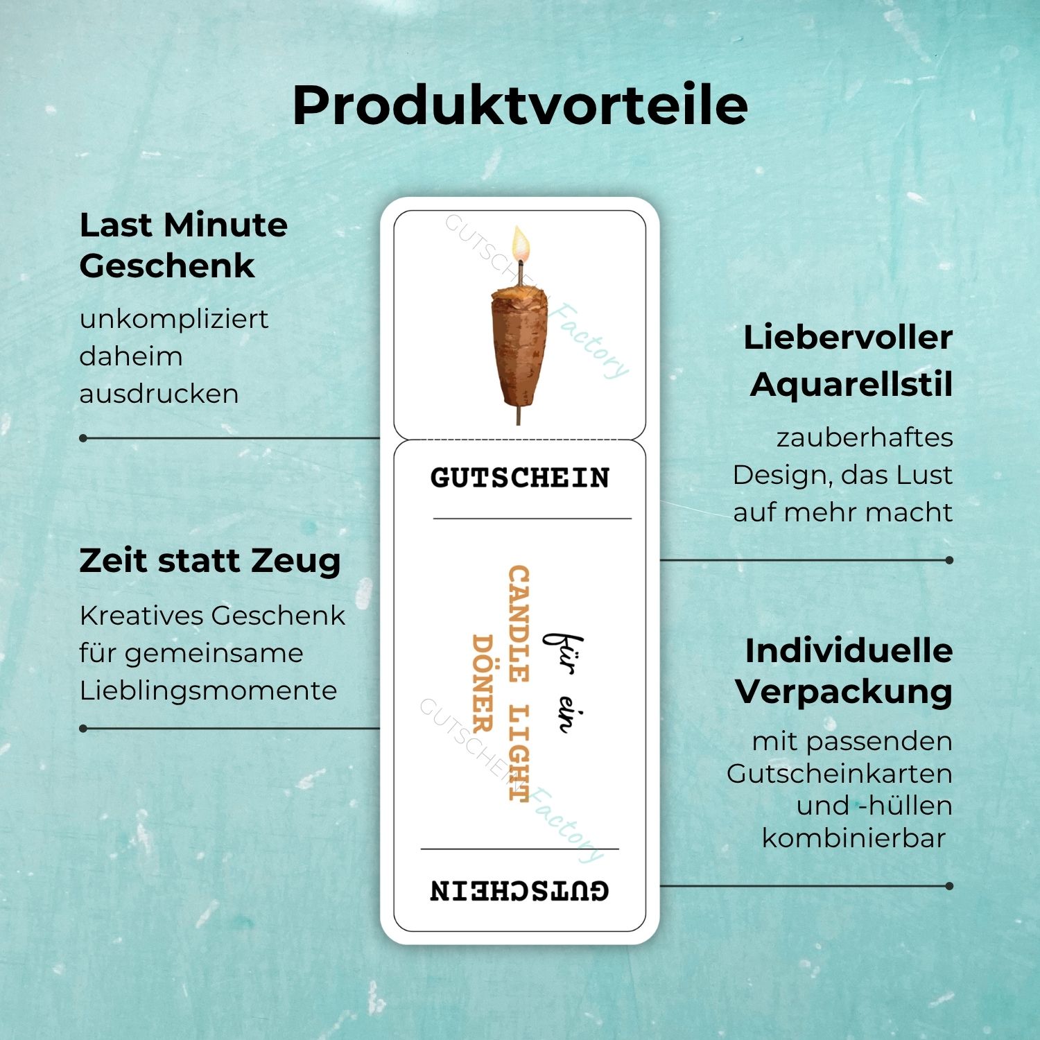 Die Candle Light Döner Gutschein Vorlage steht dir direkt als PDF-Datei zur Verfügung – kein Papierkram, kein Bastelstress. Einfach downloaden, ausdrucken und mit wenigen Handgriffen ausscheiden: schon hältst du ein liebevoll gestaltetes Geschenk in den Händen. Der Gutschein macht nicht nur kulinarisch Lust, sondern wirkt durch sein Design sofort besonders.