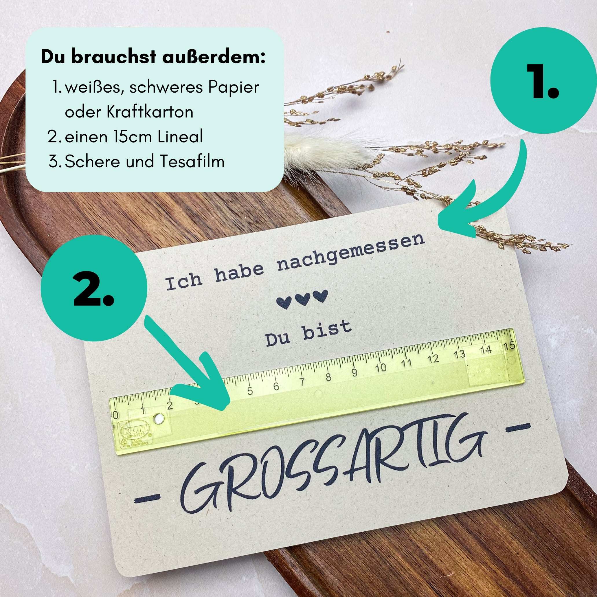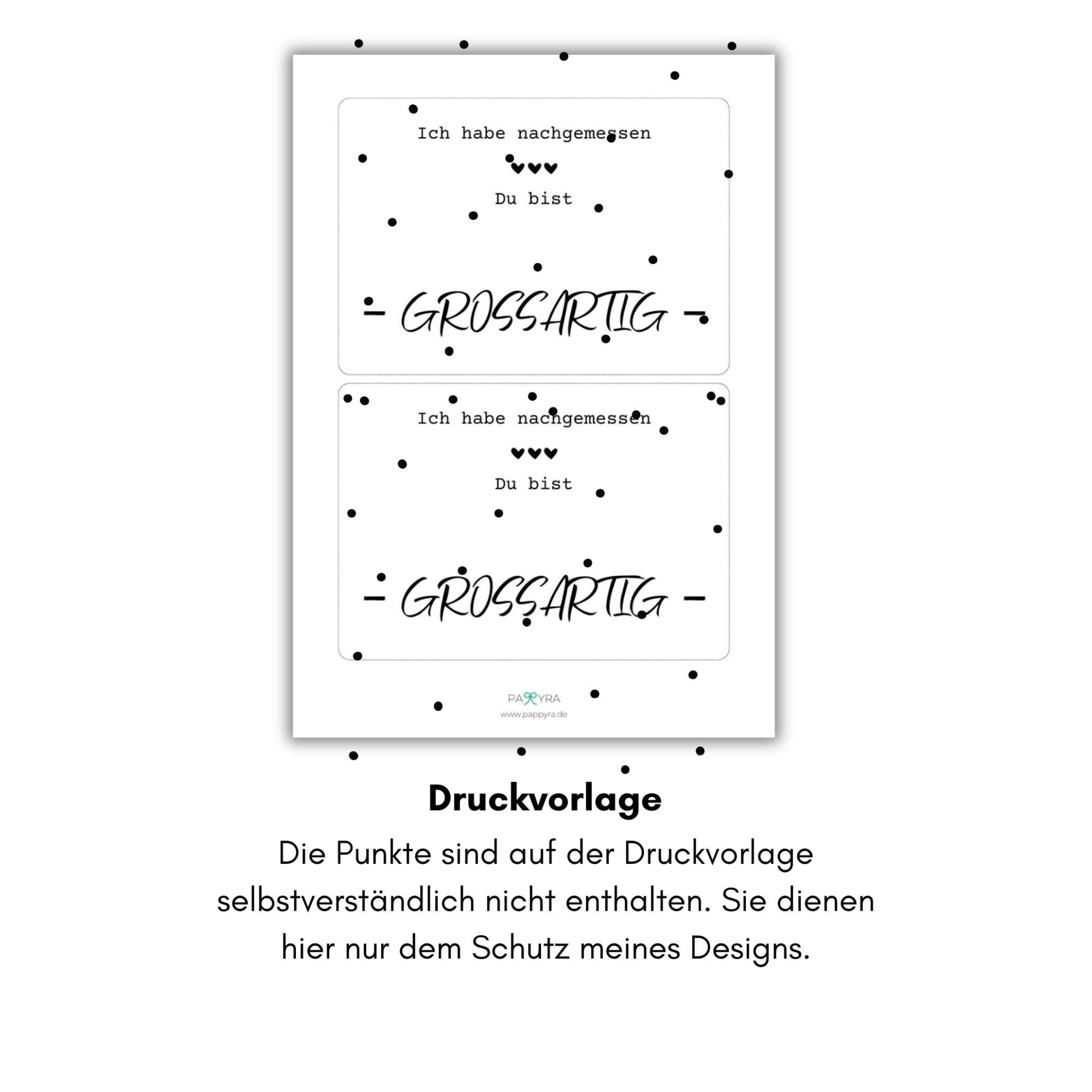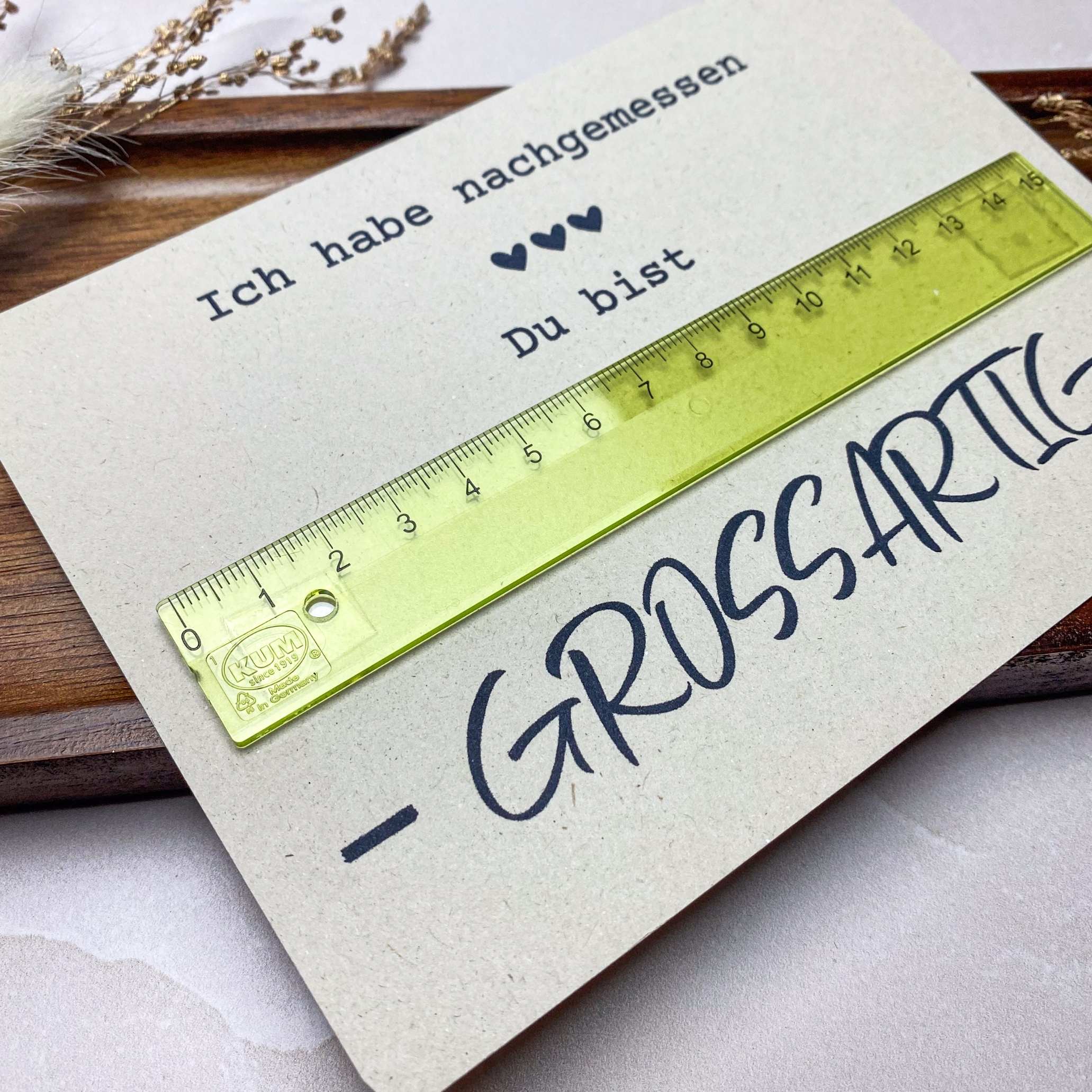 Kreative Druckvorlage für eine Karte mit dem Spruch „Ich habe nachgemessen: Du bist großartig“, die durch ein aufgeklebtes Lineal zum originellen Geschenk wird.