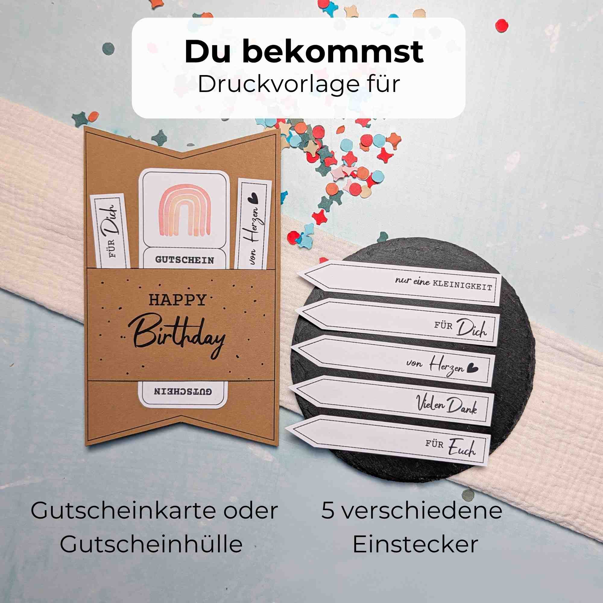 Mach aus dem Gutschein eine kleine Geburtstagsüberraschung: Lege die Karte in eine Box mit Konfetti, binde ein hübsches Schleifenband drum – oder befestige sie an einem Heliumballon.