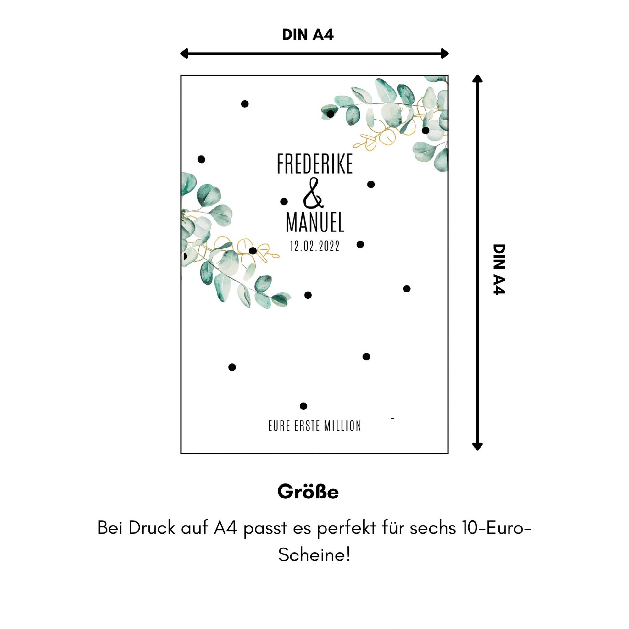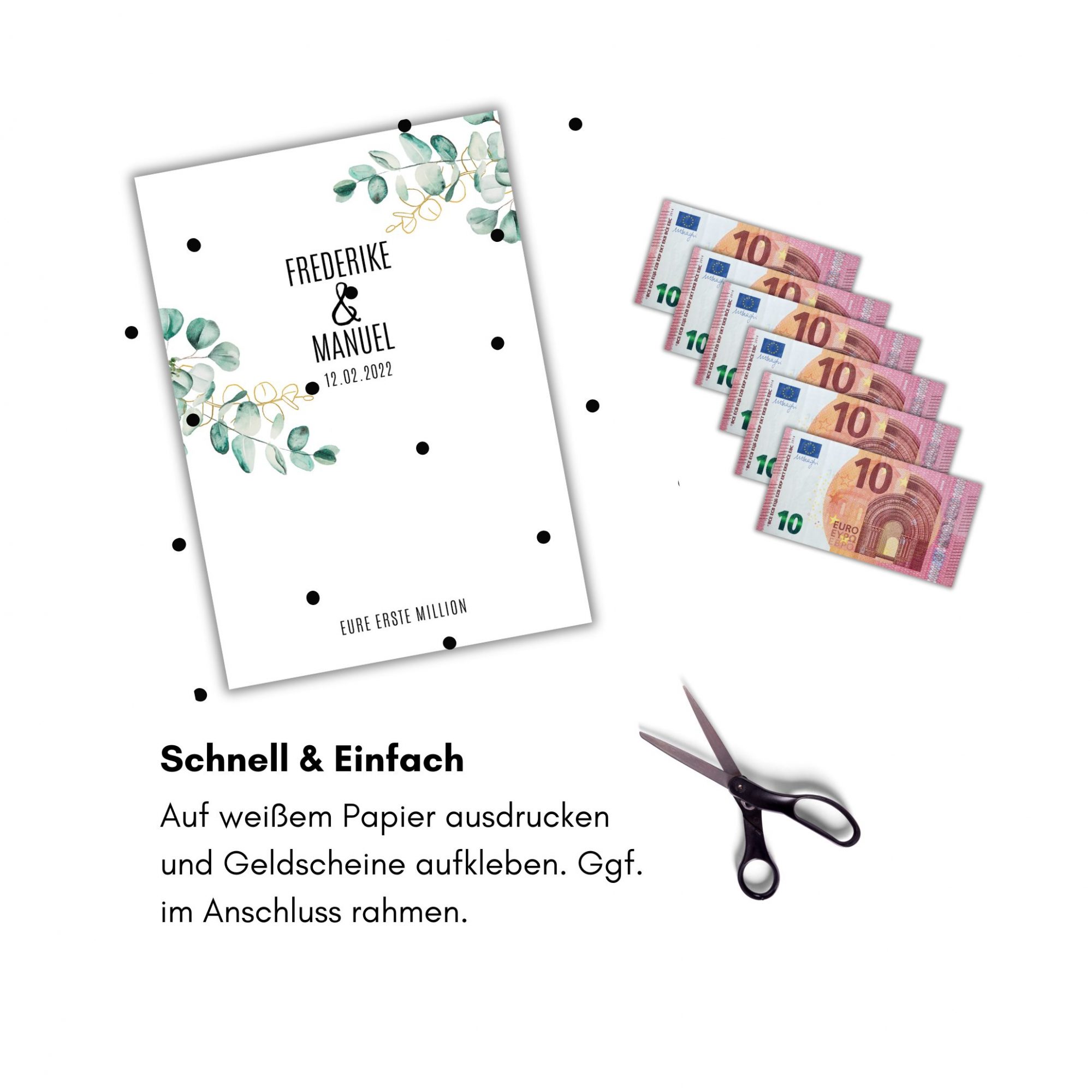 Geldgeschenk zur Hochzeit „Eure erste Million“ als PDF zum Ausdrucken. Der Namen des Brautpaars und das Hochzeitsdatum auf dem Poster kann vor dem Drucken am Computer individualisiert werden.