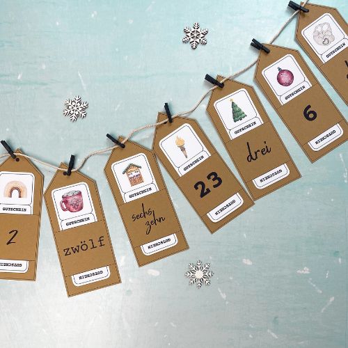 Auch die Gutscheine werden ganz einfach ausgedruckt & ausgeschnitten. Jetzt musst du nur noch jeden Gutschein in seine passende Zahl stecken, alles an einer Schnur aufhängen – und fertig ist dein ganz persönlicher Adventskalender.