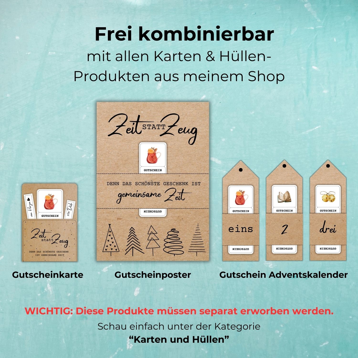 Alle Gutscheine aus dem Gutschein-Bundle „Bastelspaß & Weihnachtszauber“ lassen sich mit den passenden Karten & Hüllen aus meinem Shop kombinieren. So kannst du für jeden Anlass – ob Weihnachten, Geburtstag oder ein anderes Fest – das passende Design wählen. Zusätzlich gibt es große Poster, auf denen die Gutscheine noch eindrucksvoller wirken, und einen Gutschein-Adventskalender, der perfekt für die kleinen Vorlagen geeignet ist.