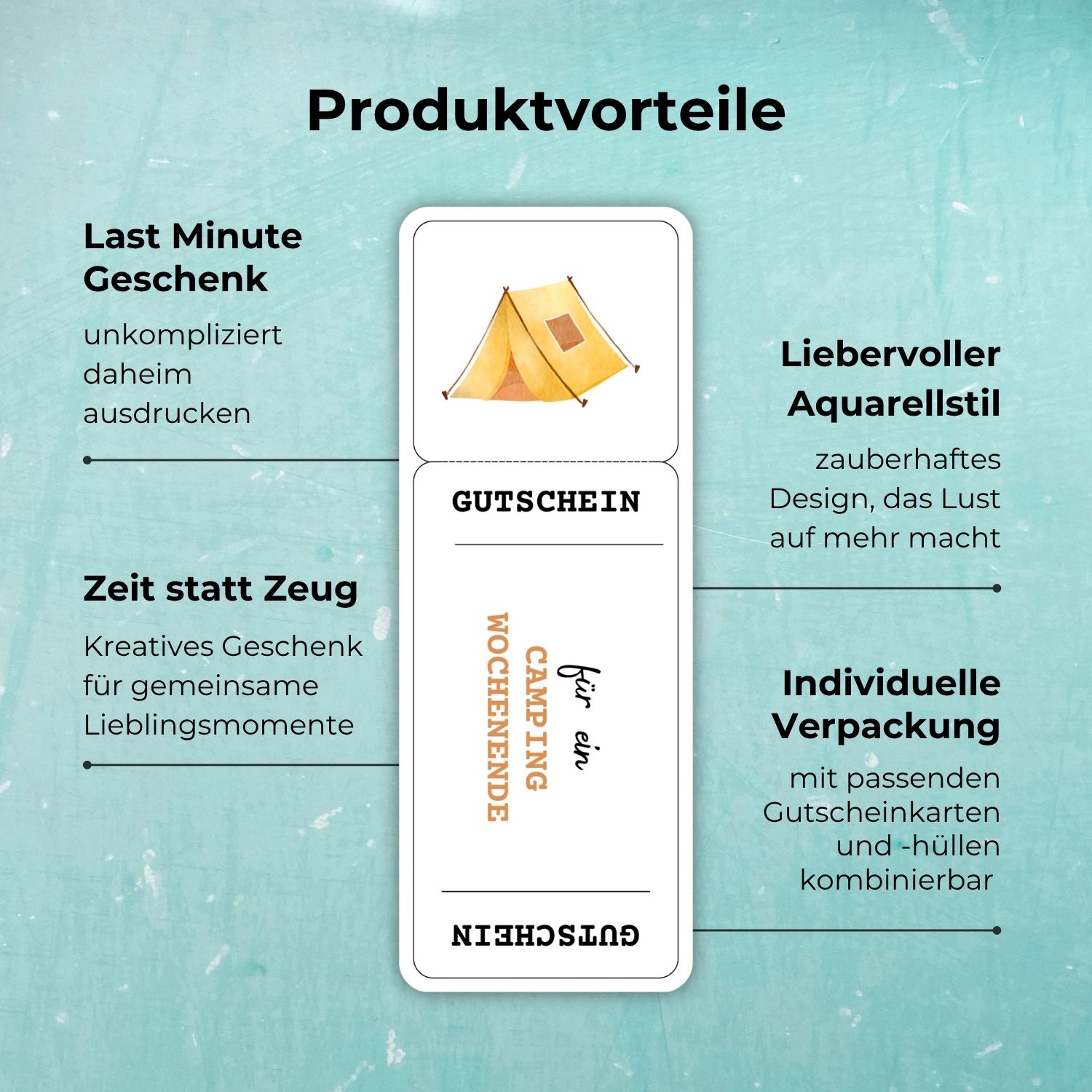 Egal ob für einen Geburtstag, Jahrestag oder einfach als kleine Überraschung zwischendurch – durch das Kombinieren mit meinen Karten & Hüllen bekommt dein Gutschein für ein Camping Wochenende den letzten Feinschliff. Alle Motive sind liebevoll gestaltet und passen perfekt zum Gutschein.