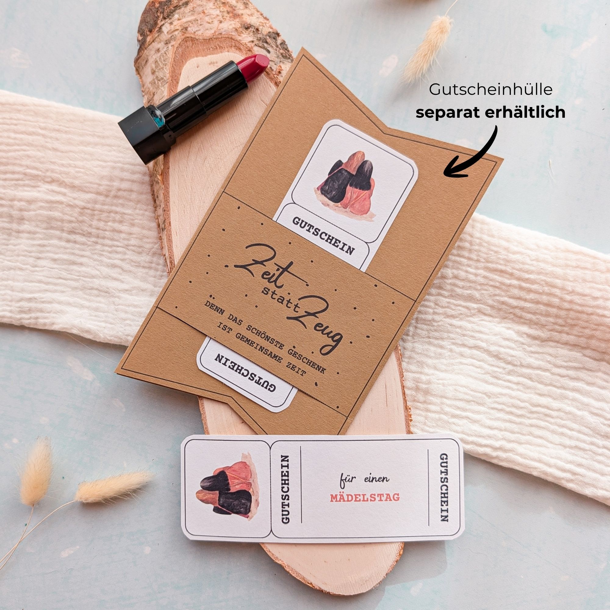 Stecke die Gutschein Mädelstag Vorlage in einen Mini-Stoffbeutel mit Trockenblumen oder binde ihn mit einem Seidenband um ein kleines Keramikstück – feminin & besonders.