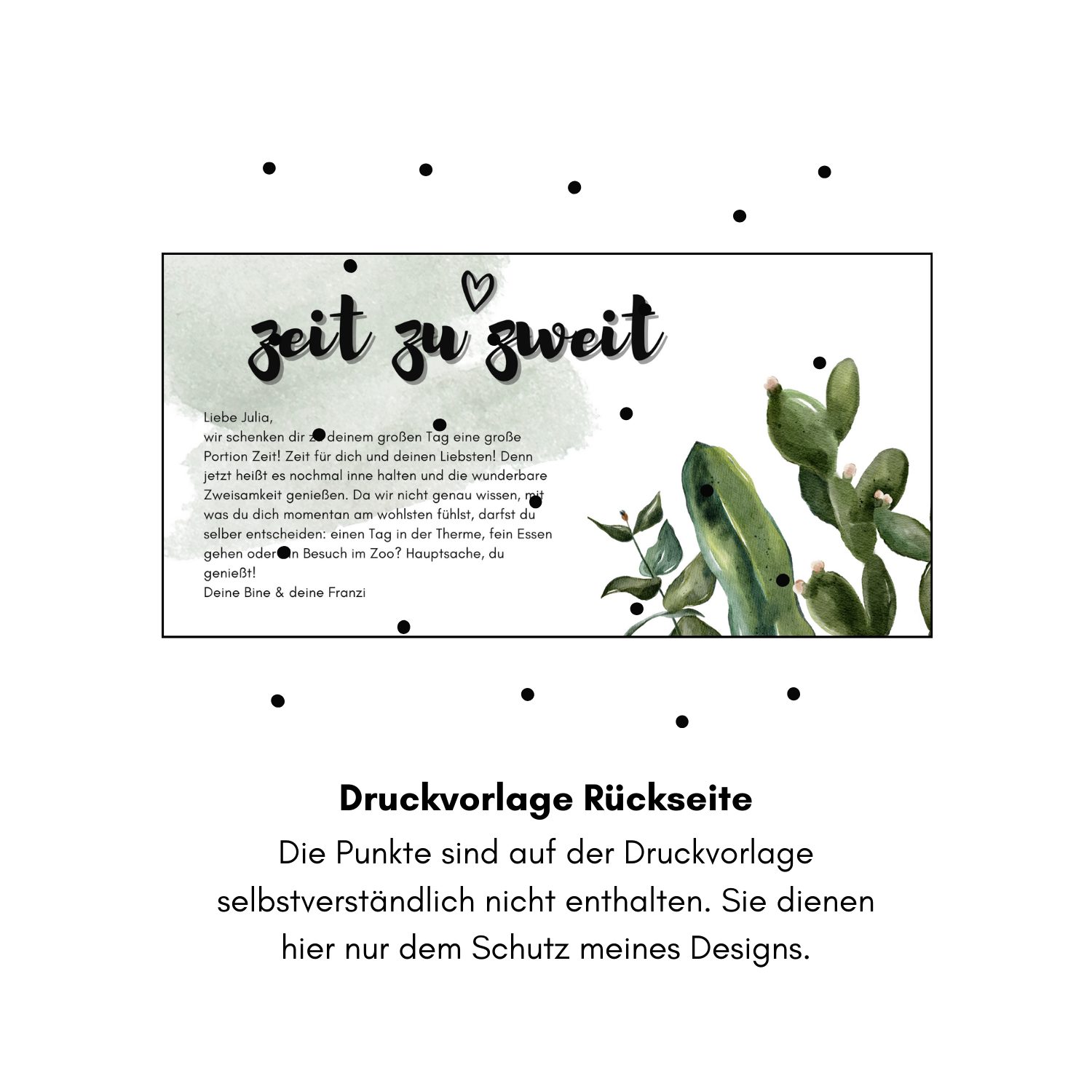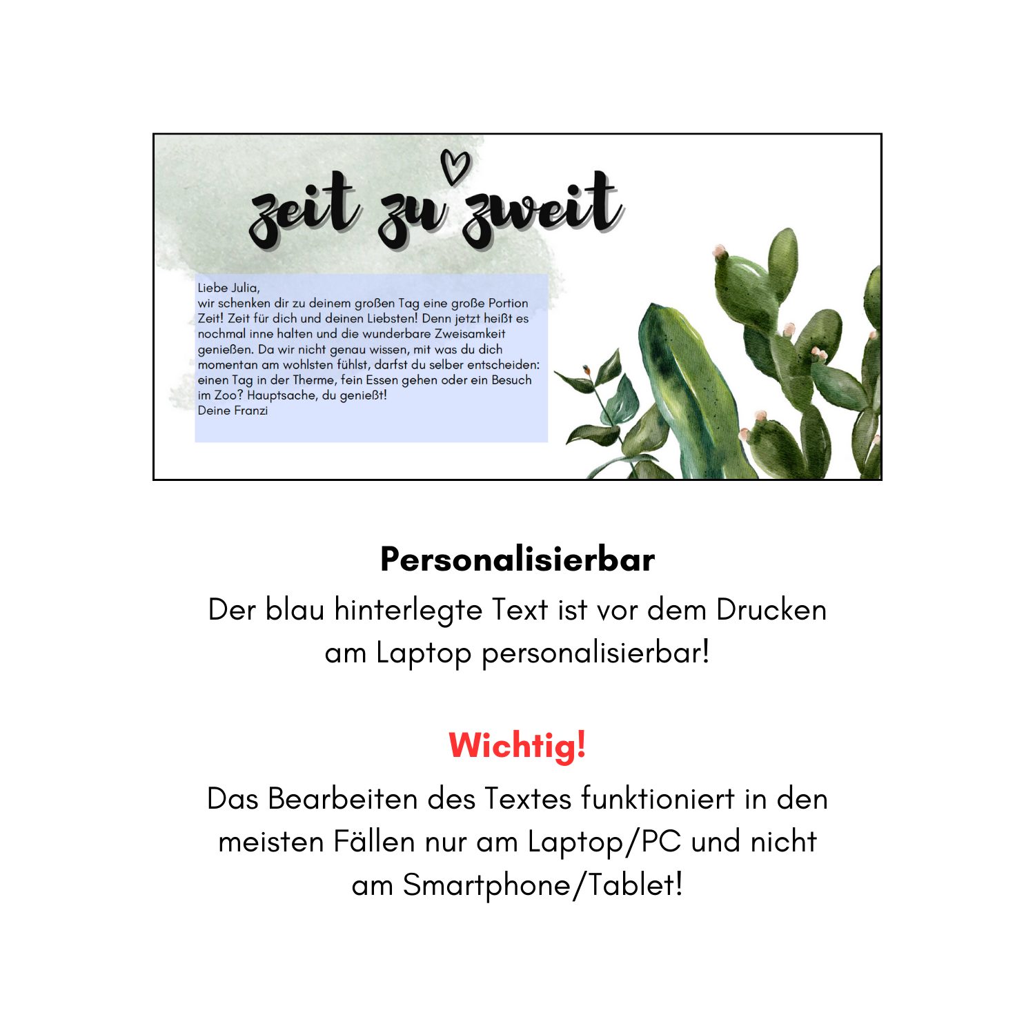 Geschenkgutschein „Zeit zu Zweit“ als PDF zum Ausdrucken. Der Text auf dem Gutschein kann vor dem Drucken am Computer individualisiert werden.