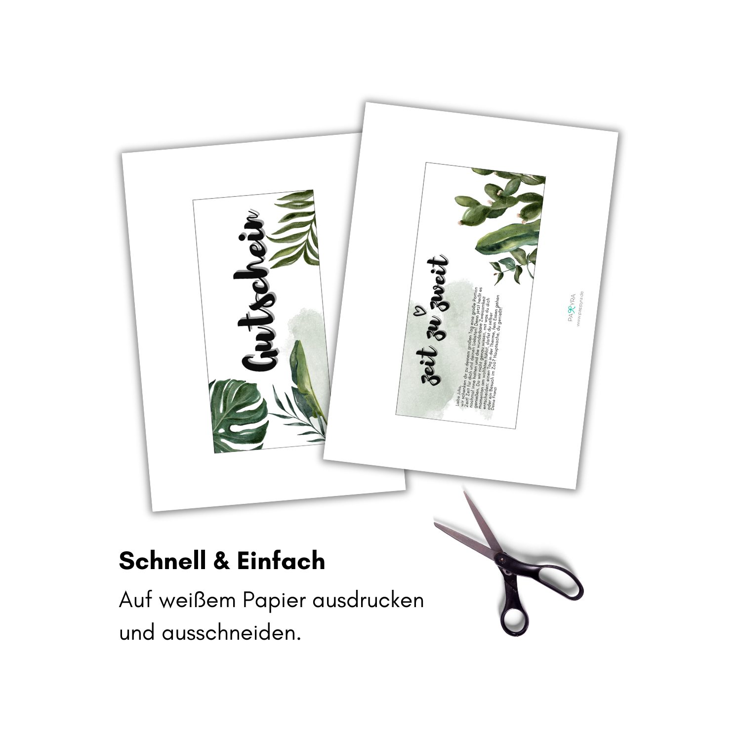 Falls du kein schweres Papier daheim hast, keine Sorge! Drucke die Datei auf normales Papier und suche dir einen alten Karton (z.B. Cornflakes-Verpackung oder Versandkarton). Nun kannst du den ausgedruckten Geschenkgutschein auf die eine Seite des Kartons kleben. Schneide anschließend den Gutschein aus und klebe dann die Rückseite des Gutscheins auf die andere Seite des Kartons. Somit ist der Gutschein stabil genug und knickt nicht.