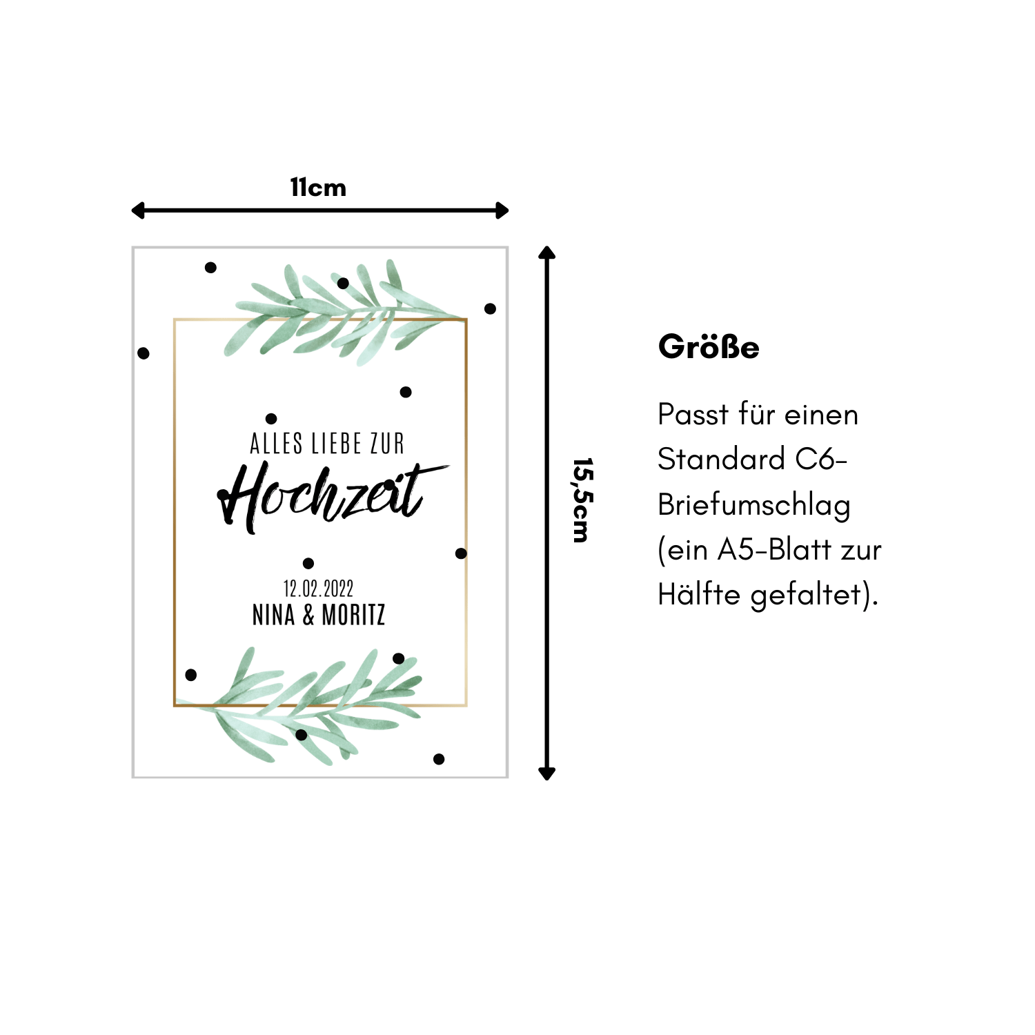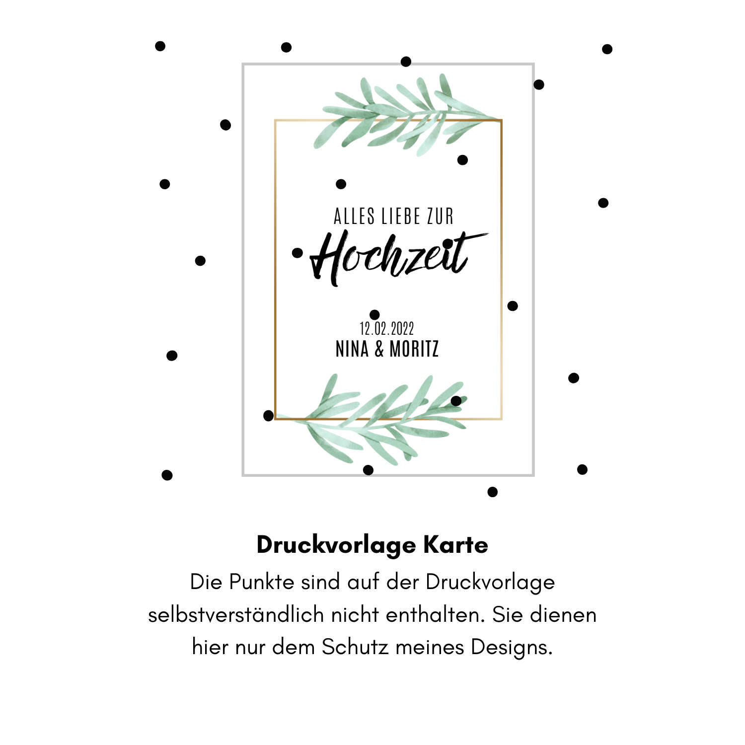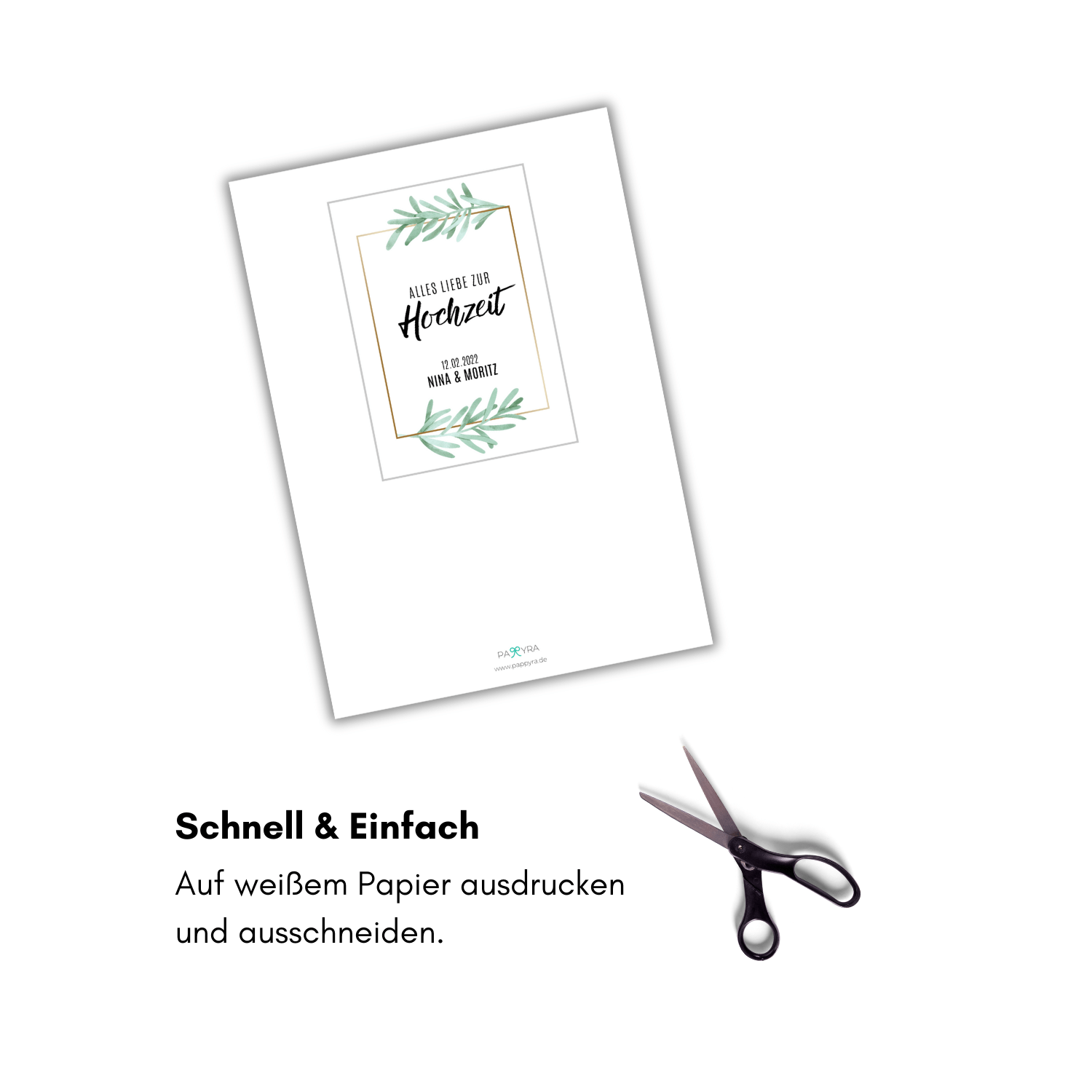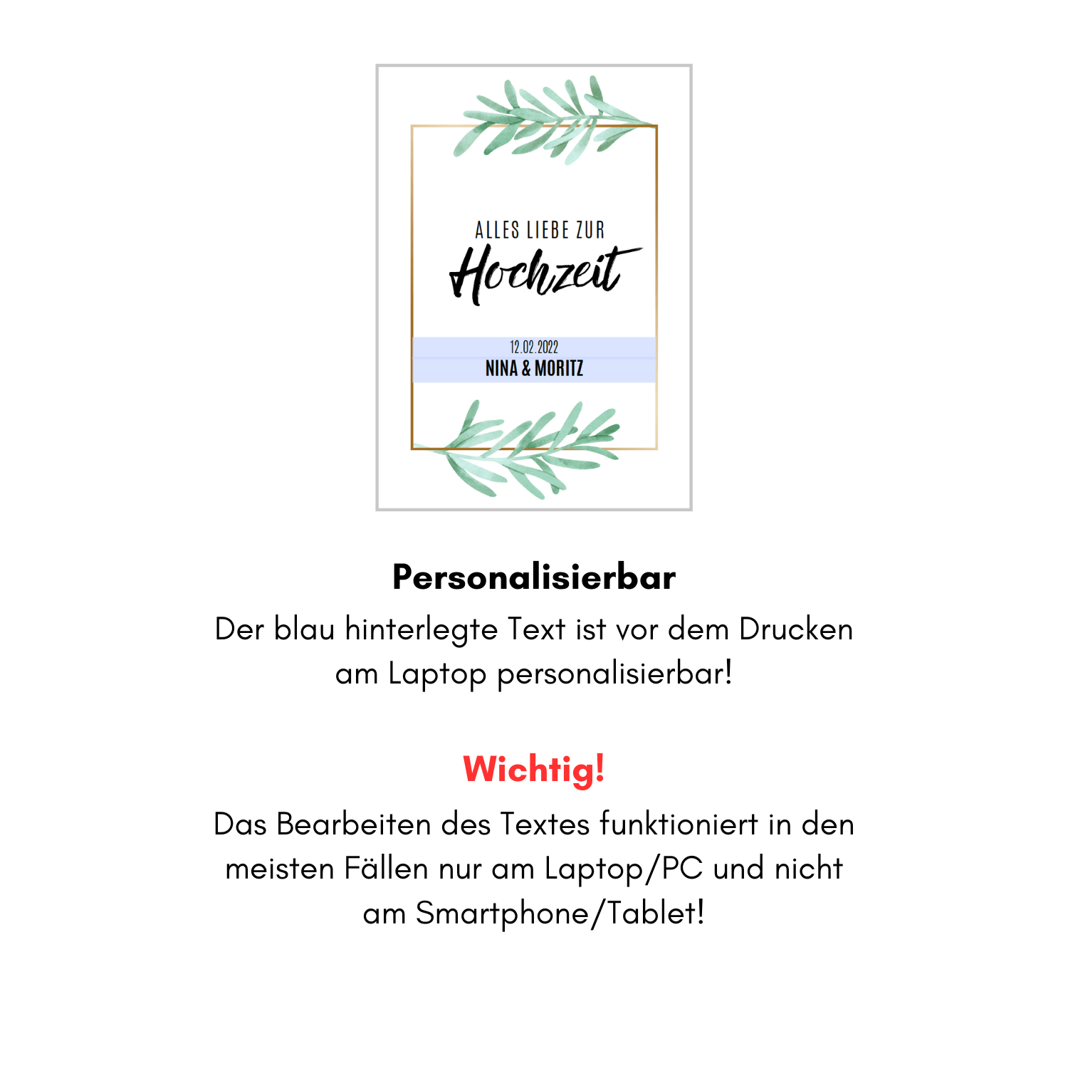 Die Namen des Brautpaars und das Datum kannst du vor dem Drucken am Computer anpassen. Somit bekommt deine Glückwunschkarte sofort einen persönlichen Charakter.