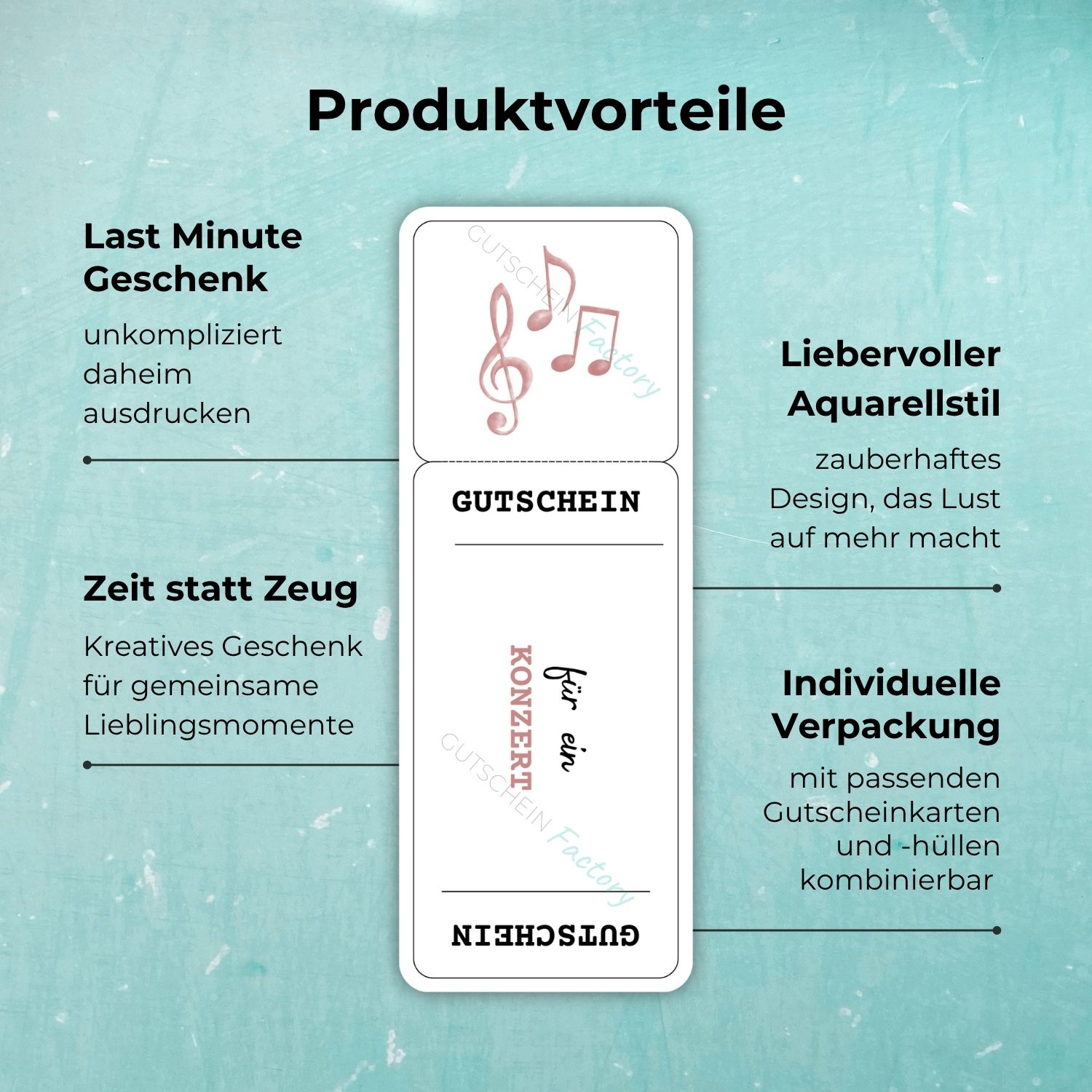 Du kannst deinen Konzert Gutschein direkt nach dem Kauf herunterladen und ganz unkompliziert basteln. Einfach ausdrucken und ausschneiden – schon hältst du ein Geschenk in den Händen, das nicht nur liebevoll gestaltet ist, sondern auch elegant wirkt.