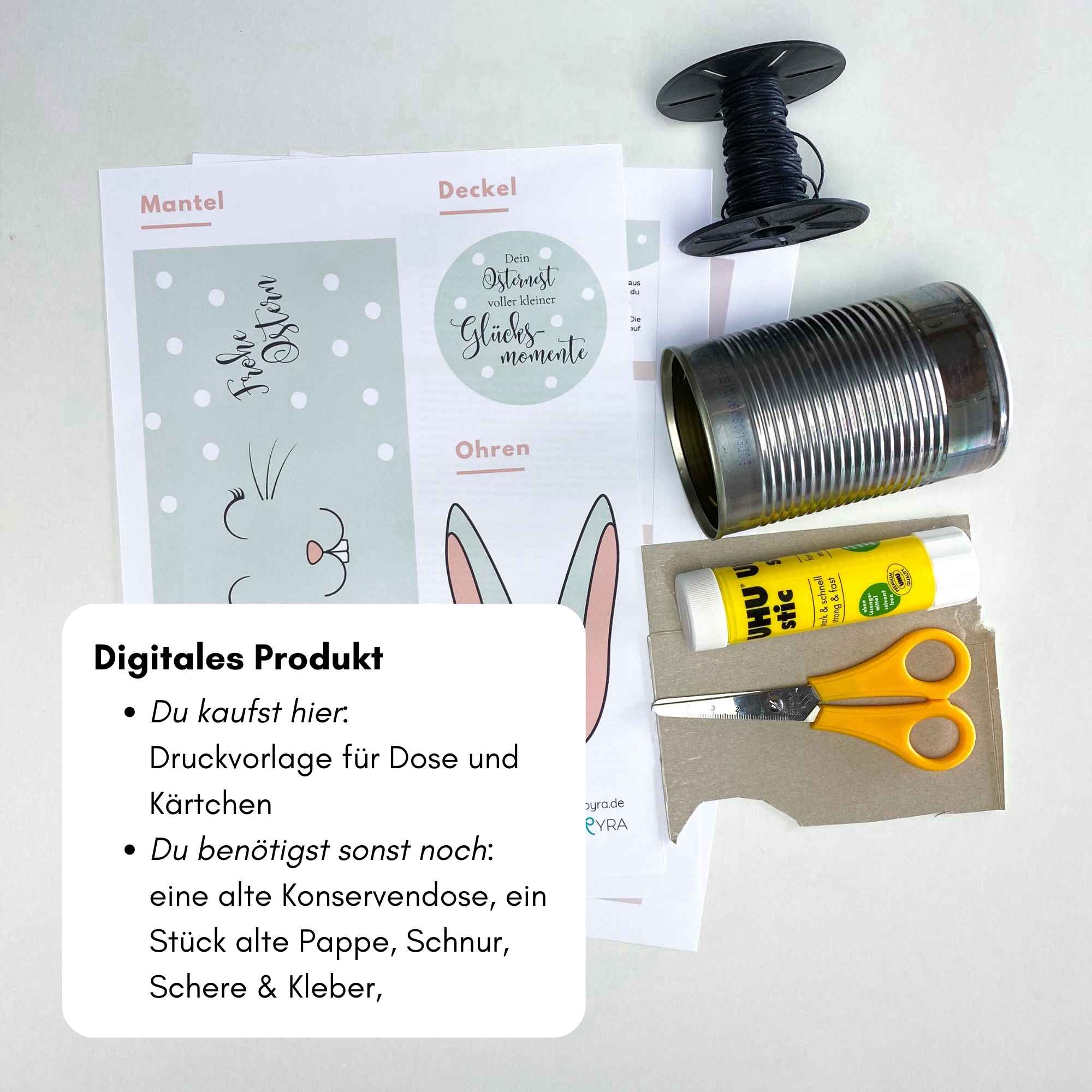 Liebevoll gestaltete Druckvorlage für ein Osterhasen-Dosen-Upcycling inklusive 42 Kärtchen für Achtsamkeit und Motivation.