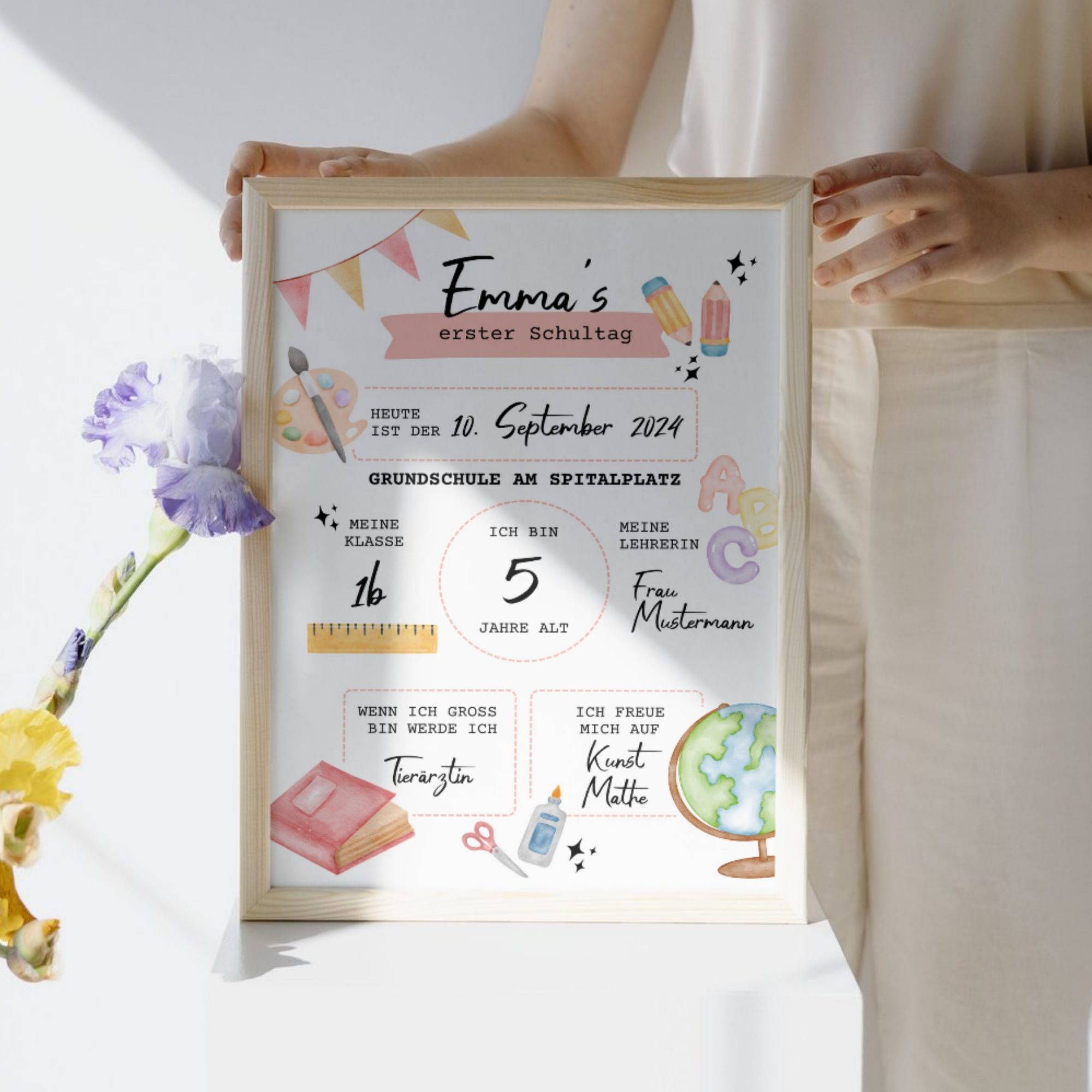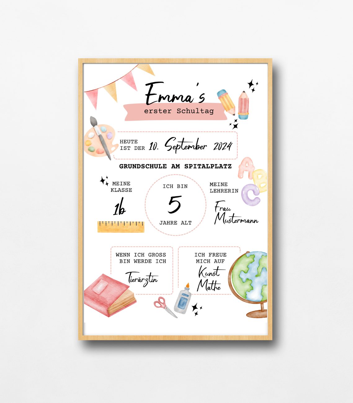 Das Poster für den Schulbeginn eignet sich super für Erstklässler. Du kannst es im Kinderzimmer aufhängen oder als Fotorequisite für die Bilder am ersten Schultag verwenden.