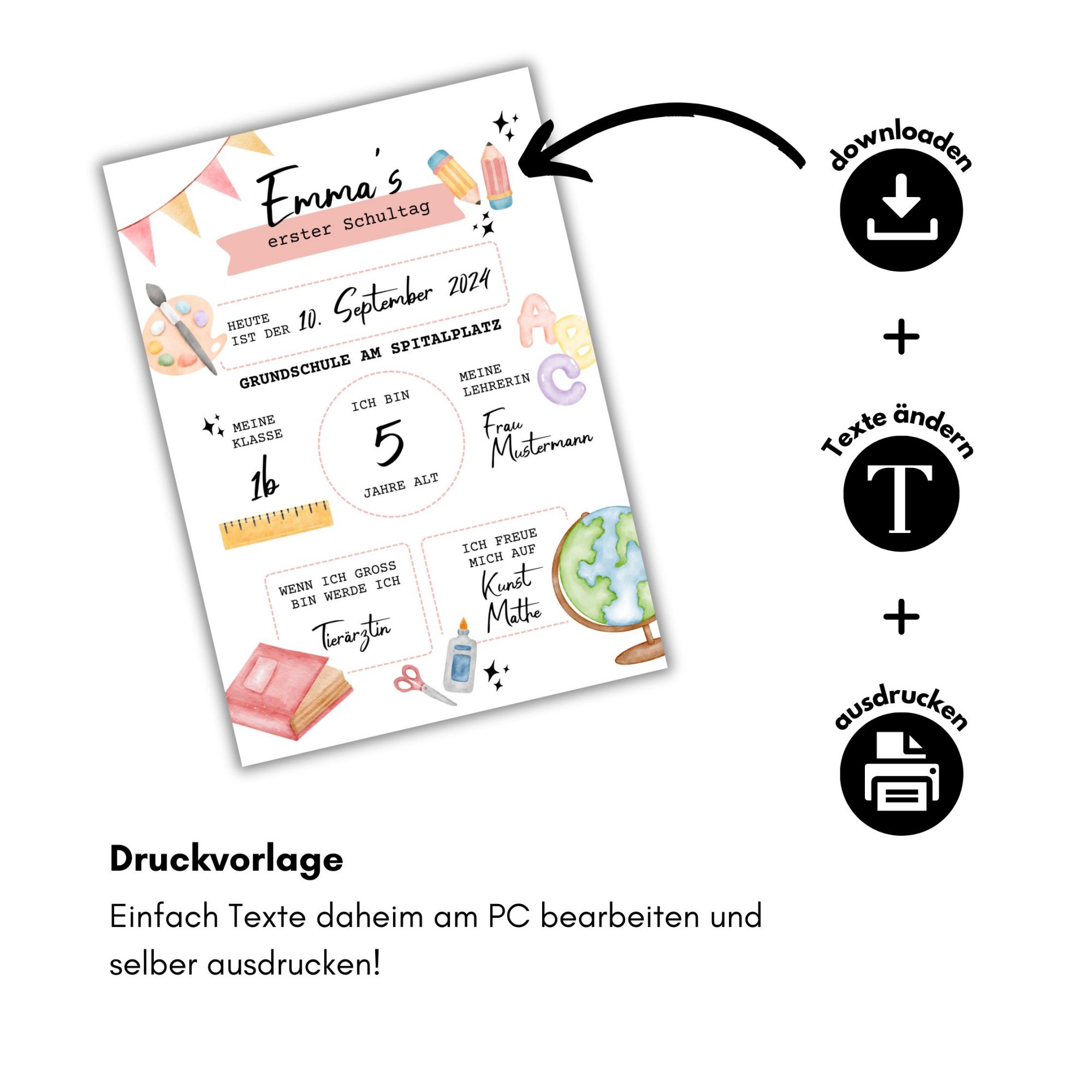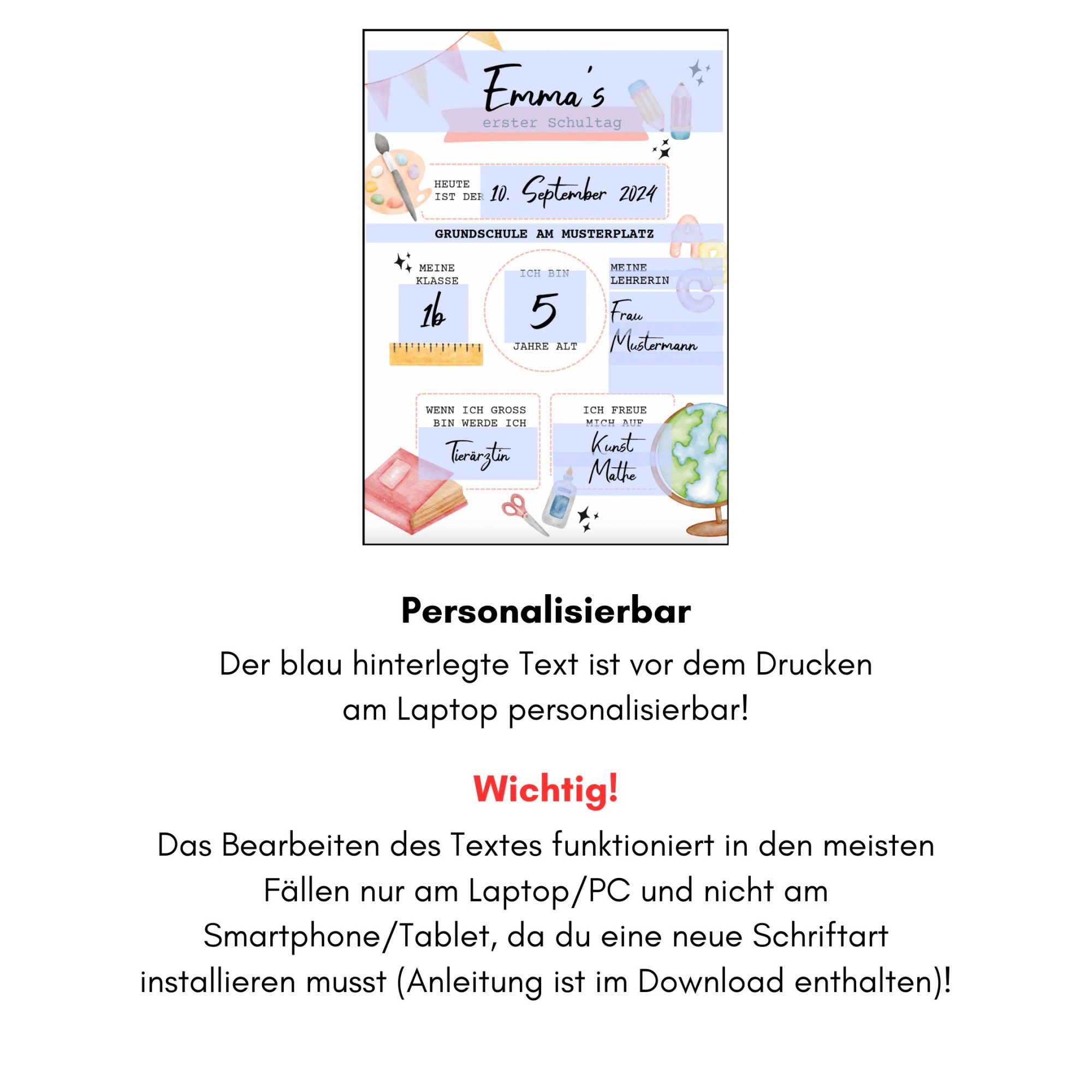 Dieses Poster zum Schulbeginn kannst du nach dem Kauf direkt herunterladen und sofort ausdrucken. Das Personalisieren der Texte erfolgt selbstständig am Laptop und du musst weder Liefer- noch Bearbeitungszeiten abwarten. Dein perfektes Last Minute Geschenk für Erstklässler!