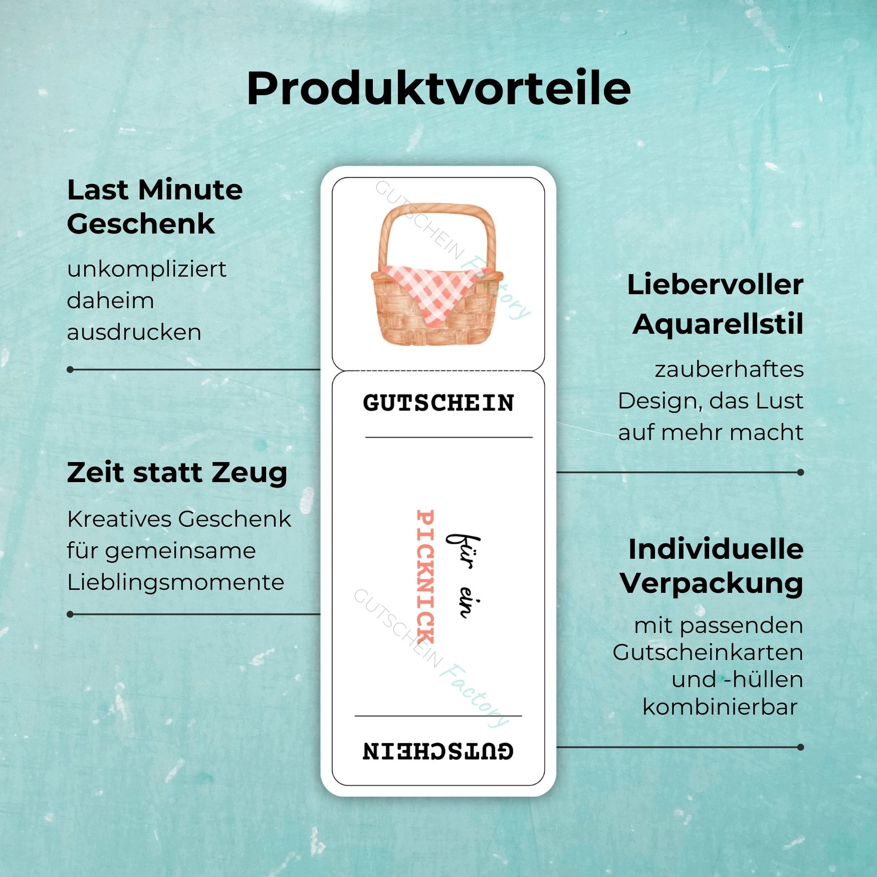 Der Picknickgutschein ist mehr als nur eine Einladung zum Essen im Grünen – er ist ein kleiner Fluchtweg aus dem Alltag. Du verschenkst Zeit, in der man barfuß über die Wiese läuft, das Kitzeln der Sonne auf der Haut spürt und zwischen Rascheln, Vogelgezwitscher und einem liebevoll gepackten Picknickkorb ganz bei sich ankommt.