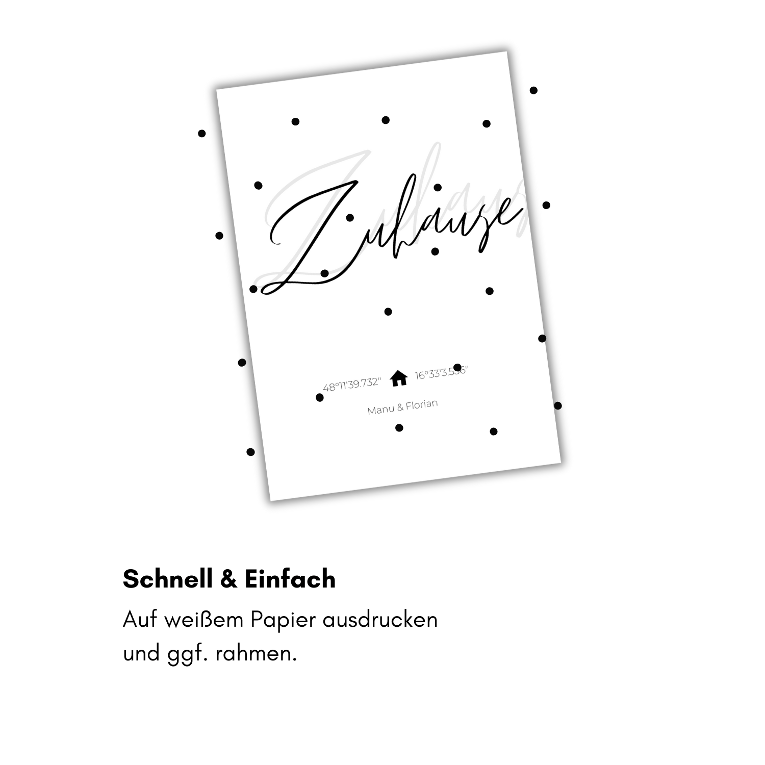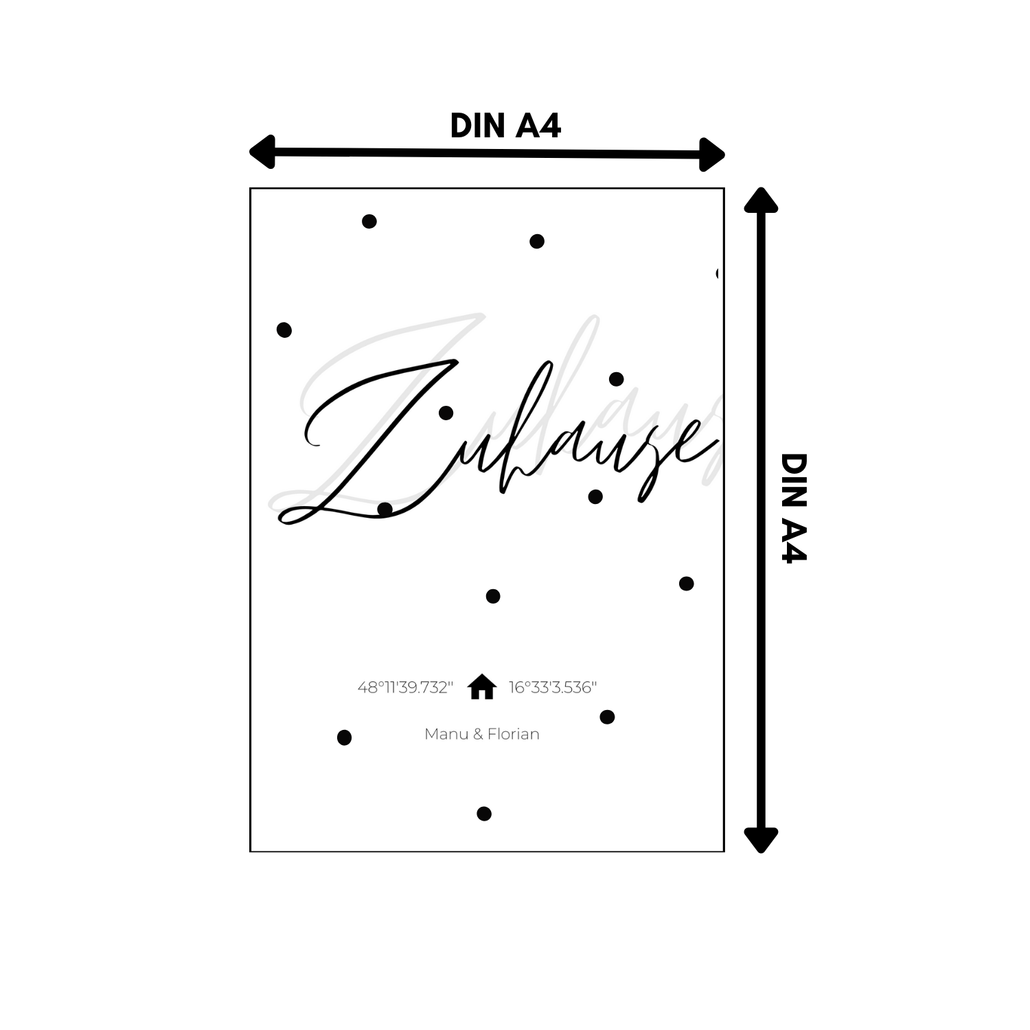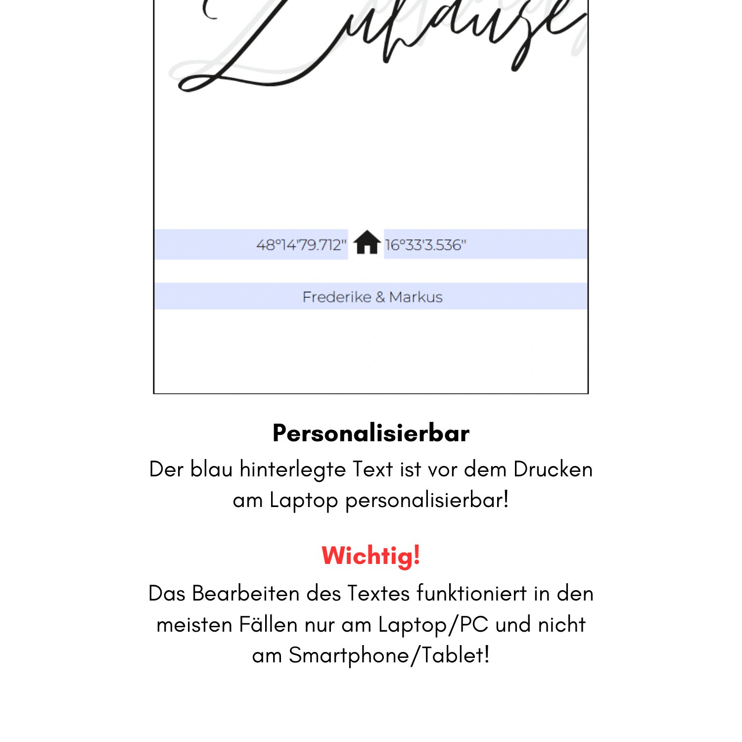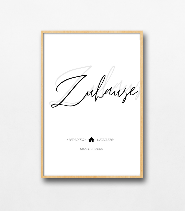Personalisierbares Zuhause Poster mit Koordinaten als PDF zum Ausdrucken. Der Text auf dem Poster kann vor dem Drucken am Computer individualisiert werden.