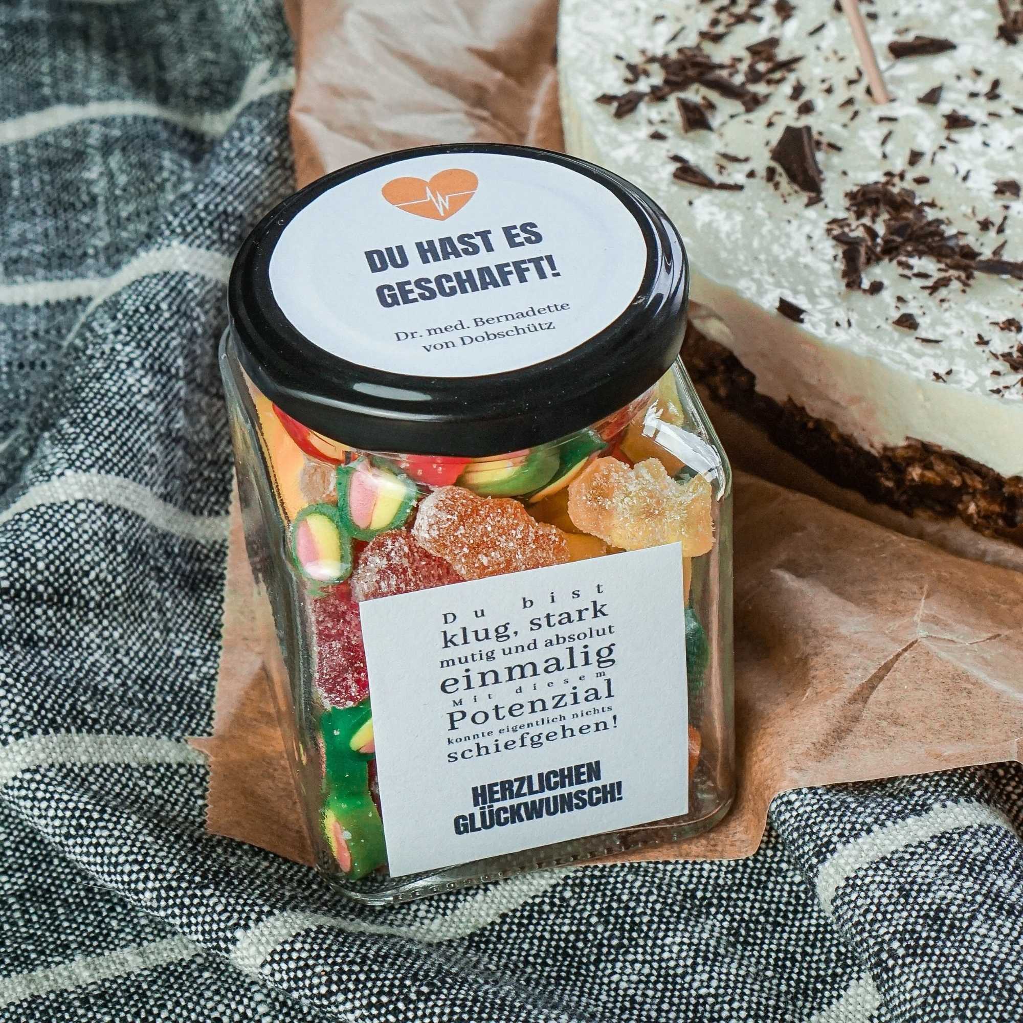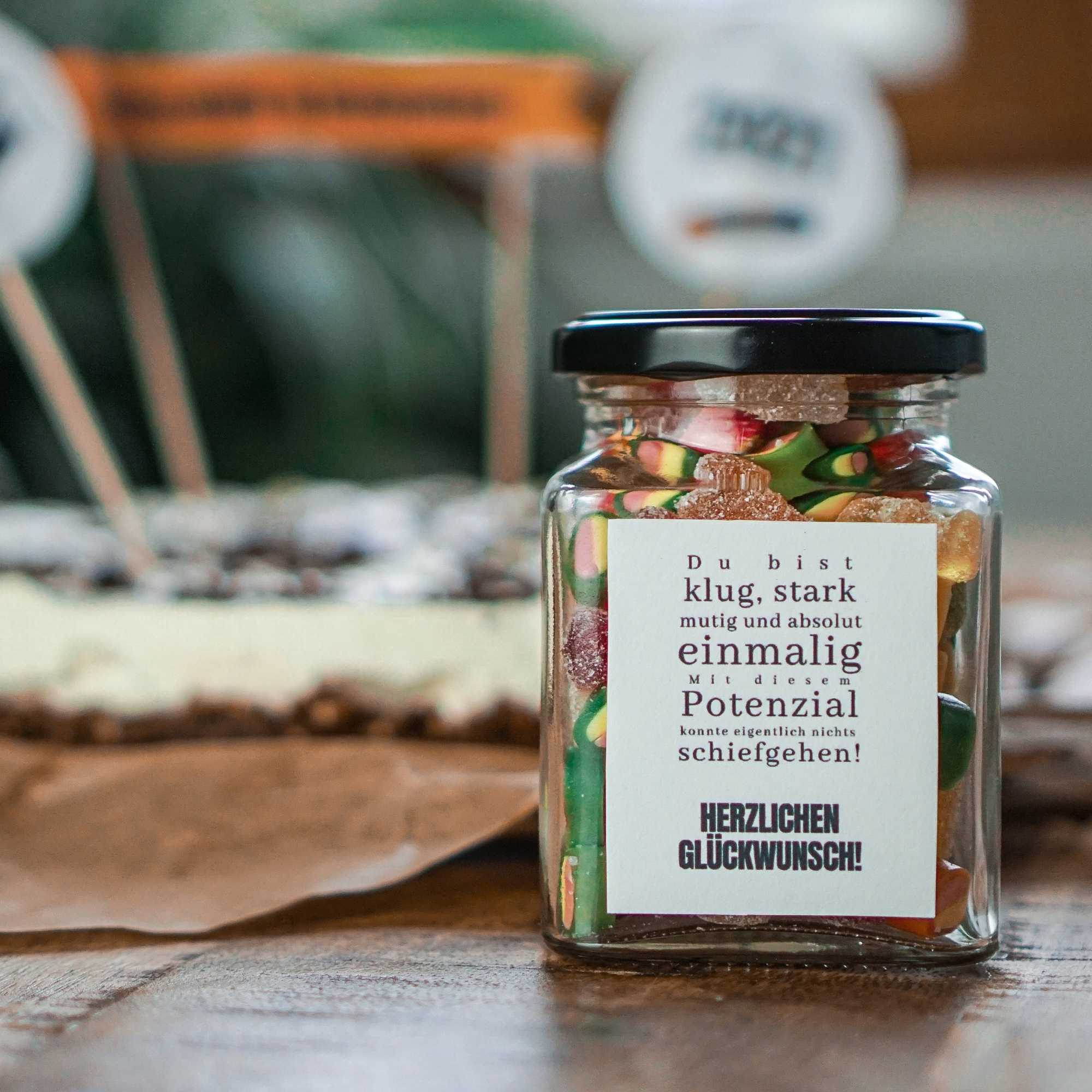 Das Glas nach Wunsch füllen – z. B. mit Gummibärchen, Schoki, kleinen Notizen oder Geldscheinen.