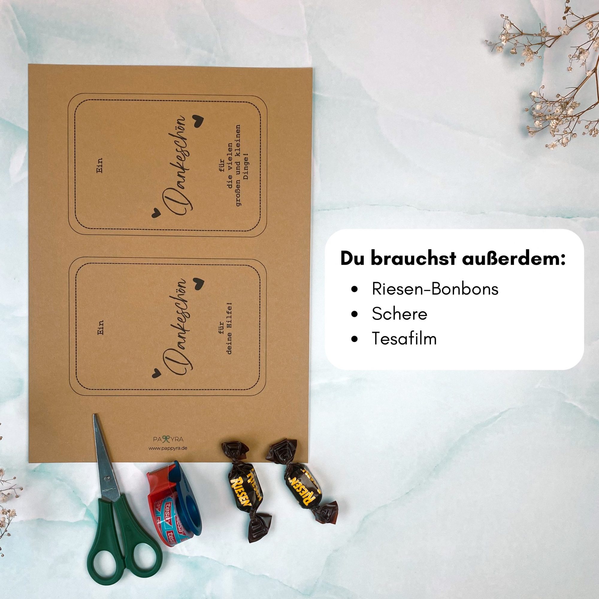 Ein paar Standardbastelmaterialien dürfen natürlich nicht fehlen, damit du die Riesen Dankeschön Karte ausschneiden und kleben kannst. Aber ich gehe mal davon aus, dass du das bereits daheim hast :)