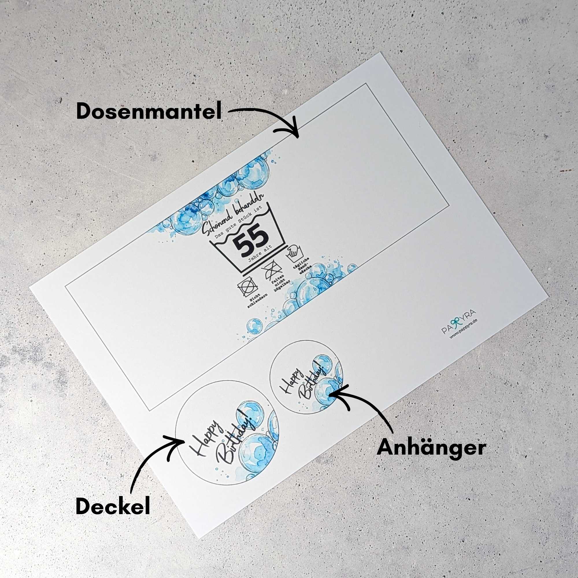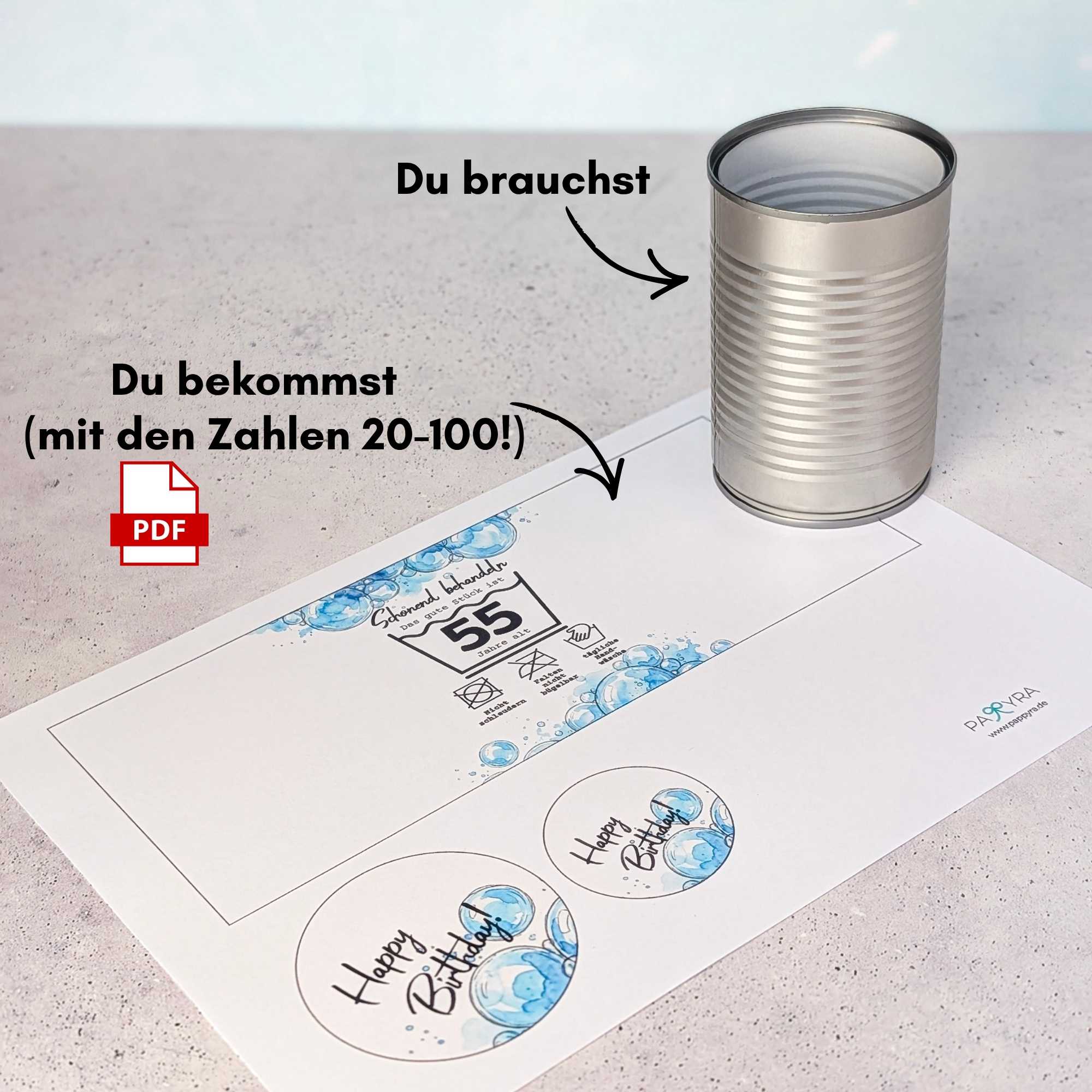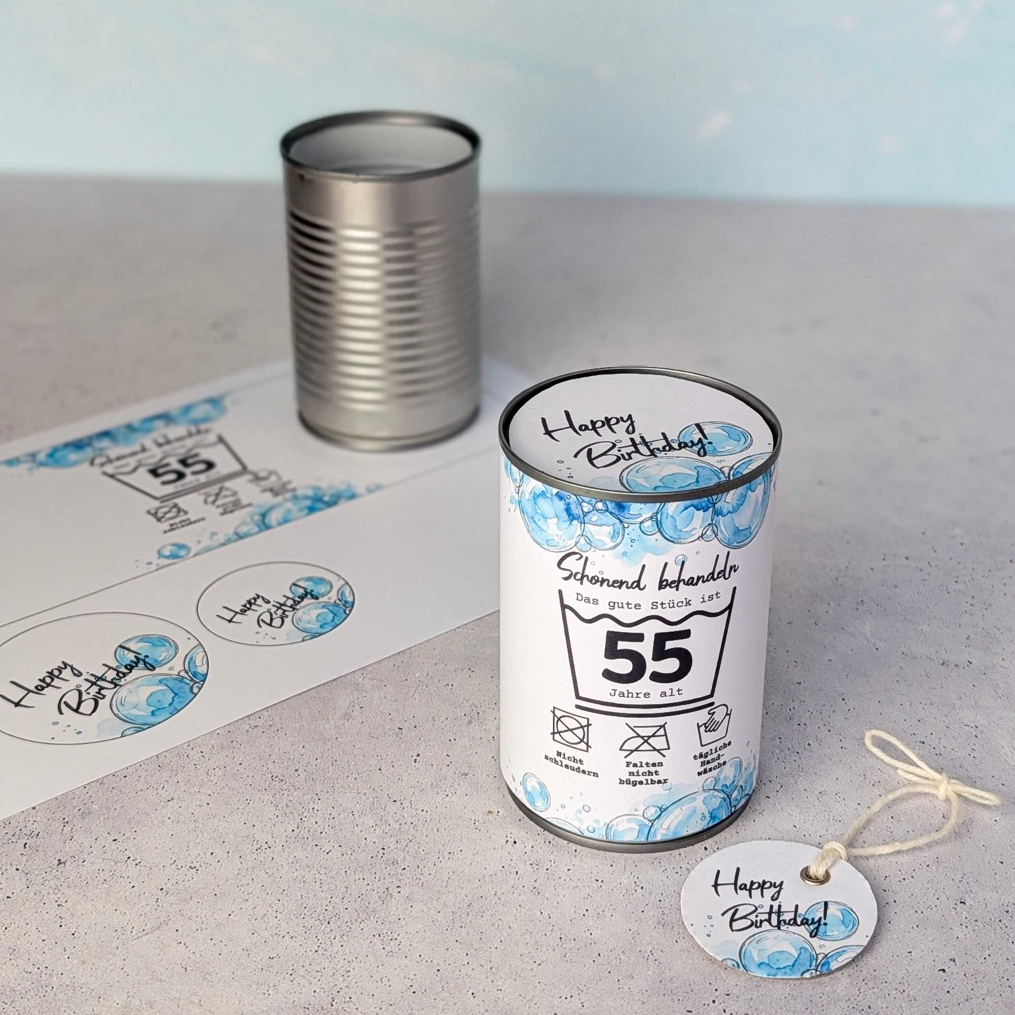 Sind wir doch mal ehrlich: Eine herkömmliche Grußkarte aus dem Supermarkt wird meistens einmal kurz durchgelesen und landet dann doch irgendwann im Müll. Diese Vorlage zum Ausdrucken ist die perfekte und nachhaltigere Alternative! Mit der gestaltete Dose hast du nicht nur eine 3D-Geburtstagkarte der anderen Art in der Hand, sondern gibst einer Konservendose ein zweites Leben! Der lustige Spruch "Schonend behandeln - das gute Stück ist [Zahl] Jahre alt. Tägliche Handwäsche, Nicht Schleudern, Falten nicht bügelbar" ist außerdem perfekt für jedes Jubiläum und du die Dose kannst du dank der flexiblen Vorlage mit allen Zahlen von 20-100 für jeden großen Geburtstag wieder verwenden.