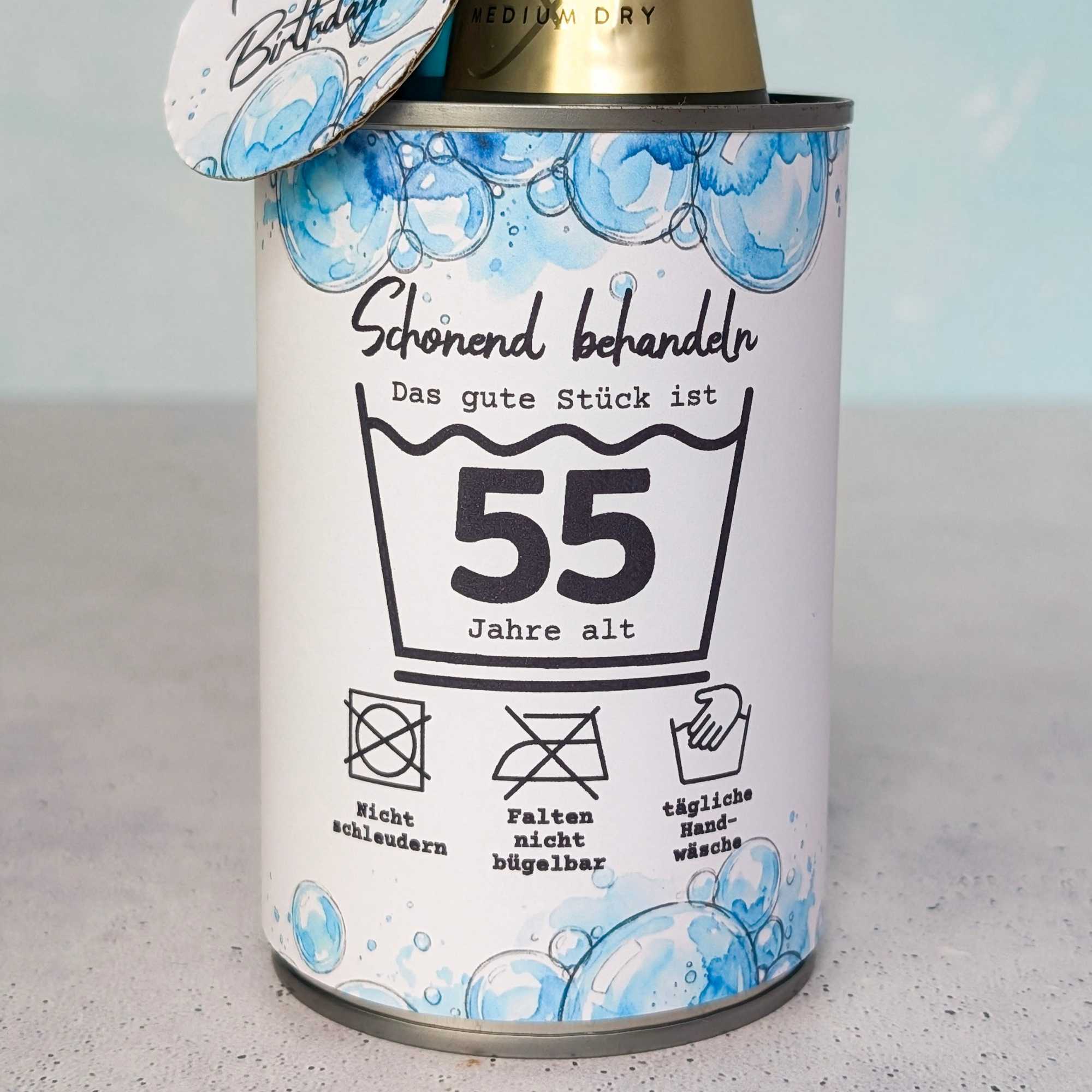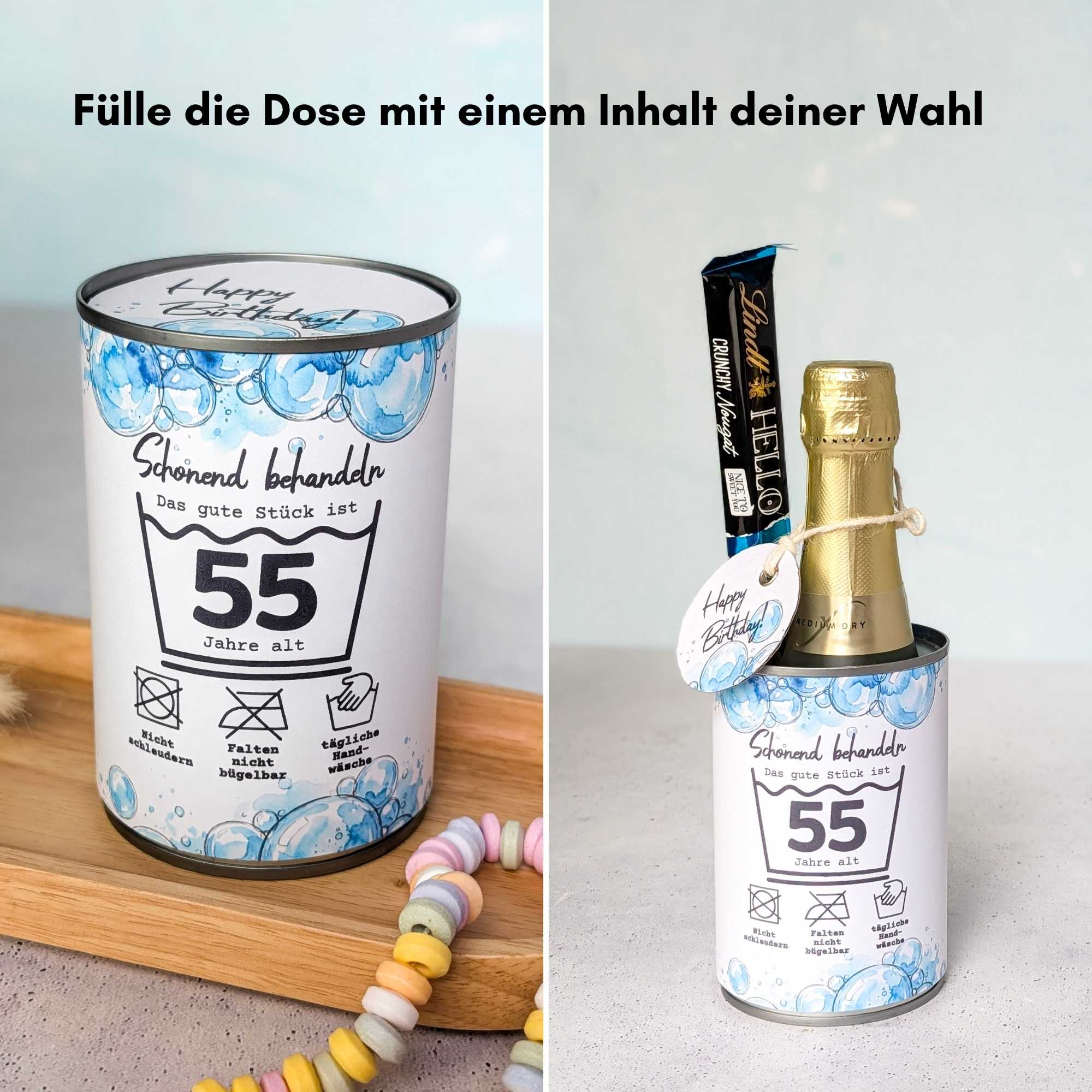 Runder Geburtstag Geschenk „Schonend behandeln“ Konservendosen Banderole