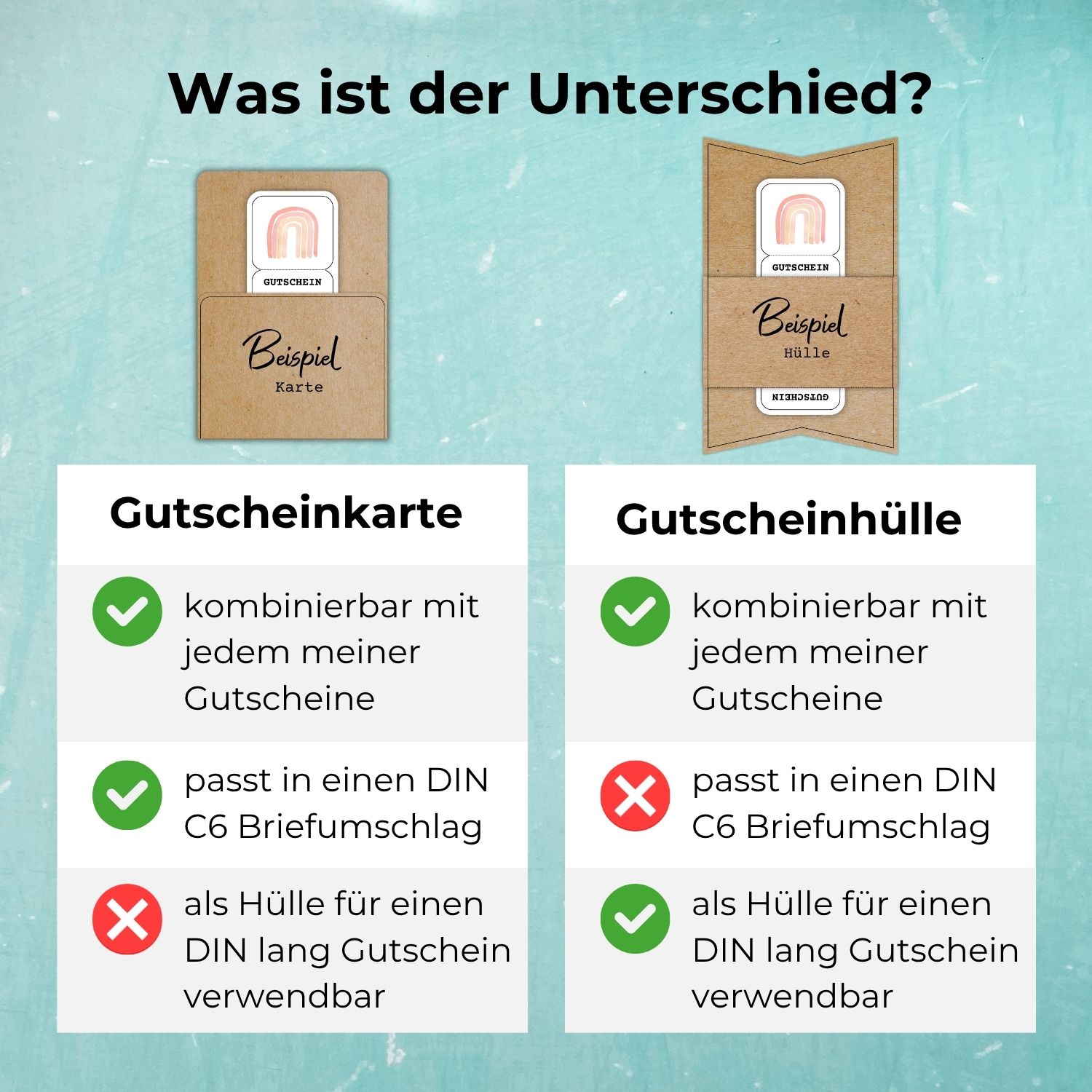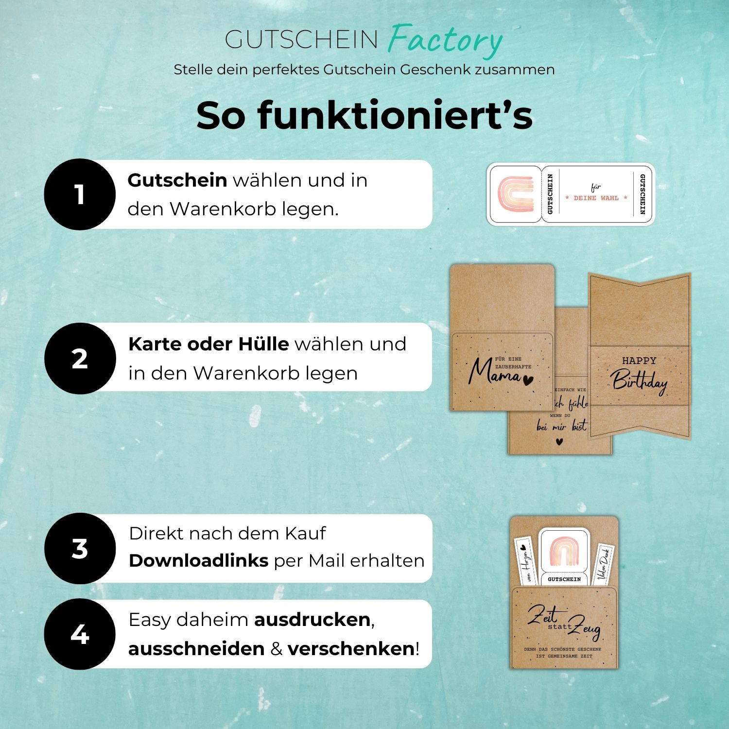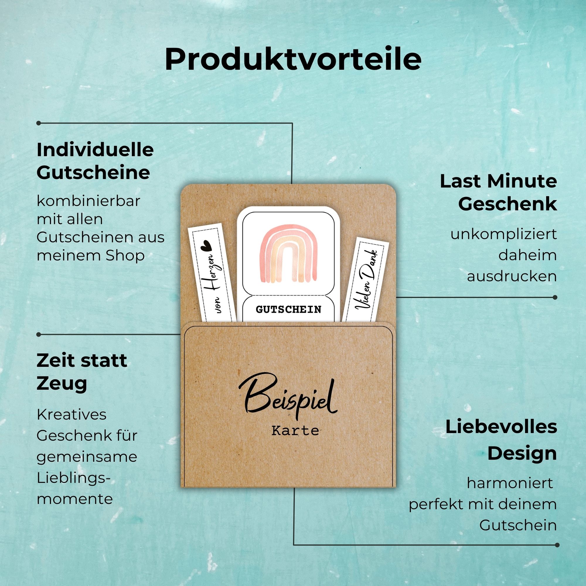 So findest du für jede Idee das passende Design – und dein Geschenk wird nicht nur persönlich, sondern auch rundum stimmig. Die Karte hebt deinen ausgedruckten Gutschein optisch hervor und macht schon das Überreichen zu einem kleinen Erlebnis.